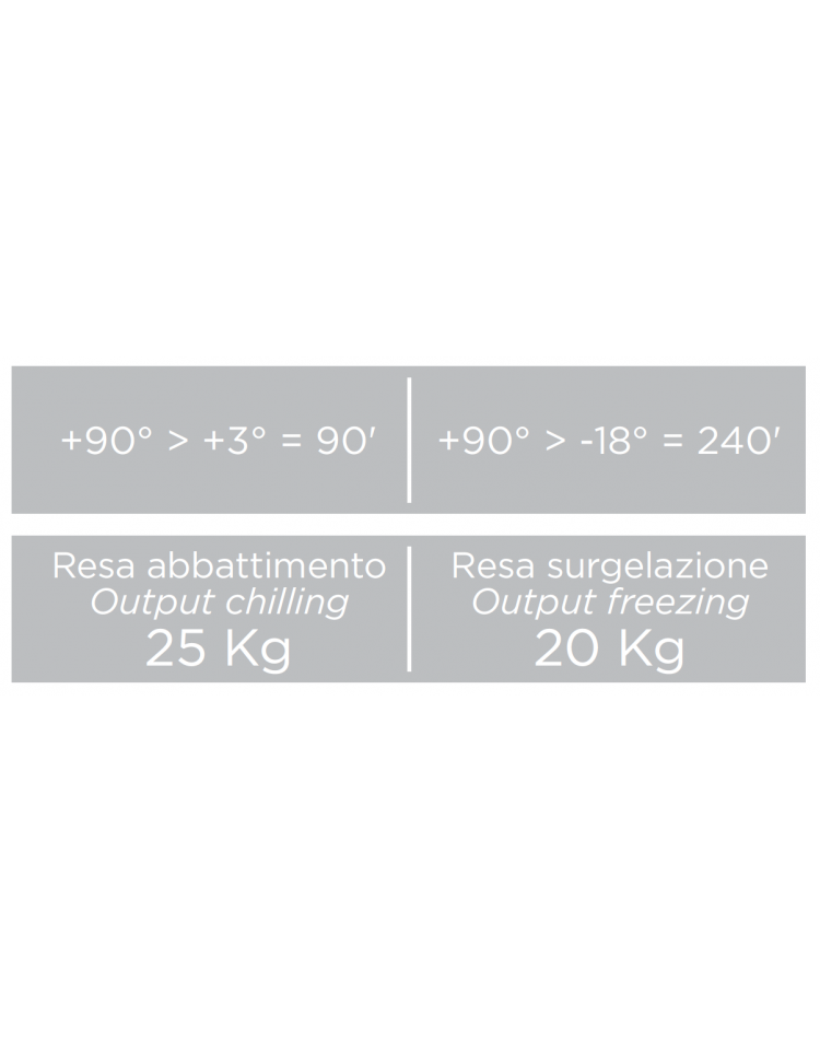 Dal design elegante e pulito, questo modello si adatta perfettamente alle esigenze di qualsiasi cucina professionale. Abbattitore adatto a contenere 10 teglie GN1/1 ed EURONORM 600x400mm. L’equipaggiamento di serie di questa attrezzatura professionale, come ad esempio il termostato digitale con segnale di allarme e messaggi di errore direttamente sul display, porta reversibile, sonda a spillone, cicli di abbattimento a temperature controllata o a tempo, modalità automatica di conservazione del cibo, fine ciclo di abbattimento, e pulsante dedicato con funzione “frost bust” (ciclo a -40 c) e “gelato”, rendendo questo modello ideale per qualsiasi uso professionale, compresa la panificazione e la gelateria.