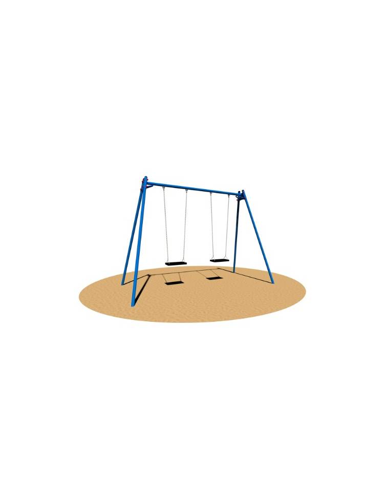 Realizzata con struttura in tubo tondo di acciaio zincato e verniciato a forno 180°. Costituita da una traversa superiore orizzontale Ø 60 mm e da quattro pali obliqui Ø 55 mm collegati tramite opportuni attacchi saldati alla traversa Sono previsti n°2 sedili piani o a gabbia in gomma antiurto con anima interna in profilato di alluminio e catene a maglia stretta saldate e zincate a fuoco. In alternativa possono essere montati due sedili in polietilene adatti anche a disabili. Assemblaggio mediante bulloneria in acciaio zincato 8.8 e dadi autobloccanti. Elementi copridado a norma in nylon colorato. Tappi copripalo in polietilene. Verniciatura a forno 180°C in polvere poliestere con elevatissima resistenza agli agenti atmosferici e alle radiazioni UV.