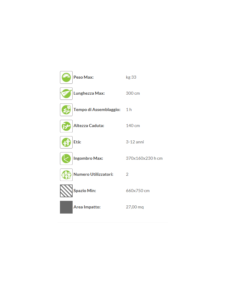 Realizzata con struttura in legno lamellare di pino nordico impregnato in autoclave con sali atossici. Costituito da n°4 montanti in legno lamellare di sez. cm 9x9 e trave a sez. rettangolare da cm 9x20. Sono previsti n°2 sedili piani o a gabbia in gomma antiurto con anima interna in profilato di alluminio e catene a maglia stretta saldate e zincate a fuoco. In alternativa possono essere montati due sedili in polietilene adatti anche a disabili. Assemblaggio mediante bulloneria in acciaio zincato 8.8 e dadi autobloccanti. Attacchi in metallo zincato a caldo per l’ancoraggio al suolo.