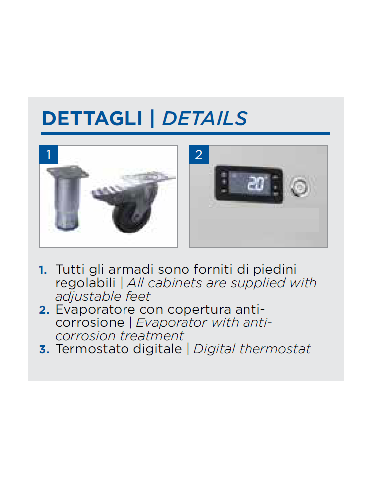 Pulito ed elegante, grazie al termostato digitale e al caratteristico design del pannello superiore e della porta, questo modello è stato sviluppato pensando alle necessità di conservazione di semilavorati e preparati per pasticceria. Il range QPN rappresenta la perfetta combinazione tra tecnologia, esperienza produttiva e attenzione all’ambiente, con porta autochiudente per evitare sprechi di energia, un set di 10 guide per vassoi 600×400 per ogni vano, gas refrigerante eco-friendly R600a e schiumatura isolante da 75 mm su ciascun lato. Termostato digitale, luce a LED, serratura di serie, porta reversibile e piedini regolabili in altezza (da 85 mm a 140 mm) contribuiscono a rendere questo frigorifero professionale un prodotto di alta fascia.