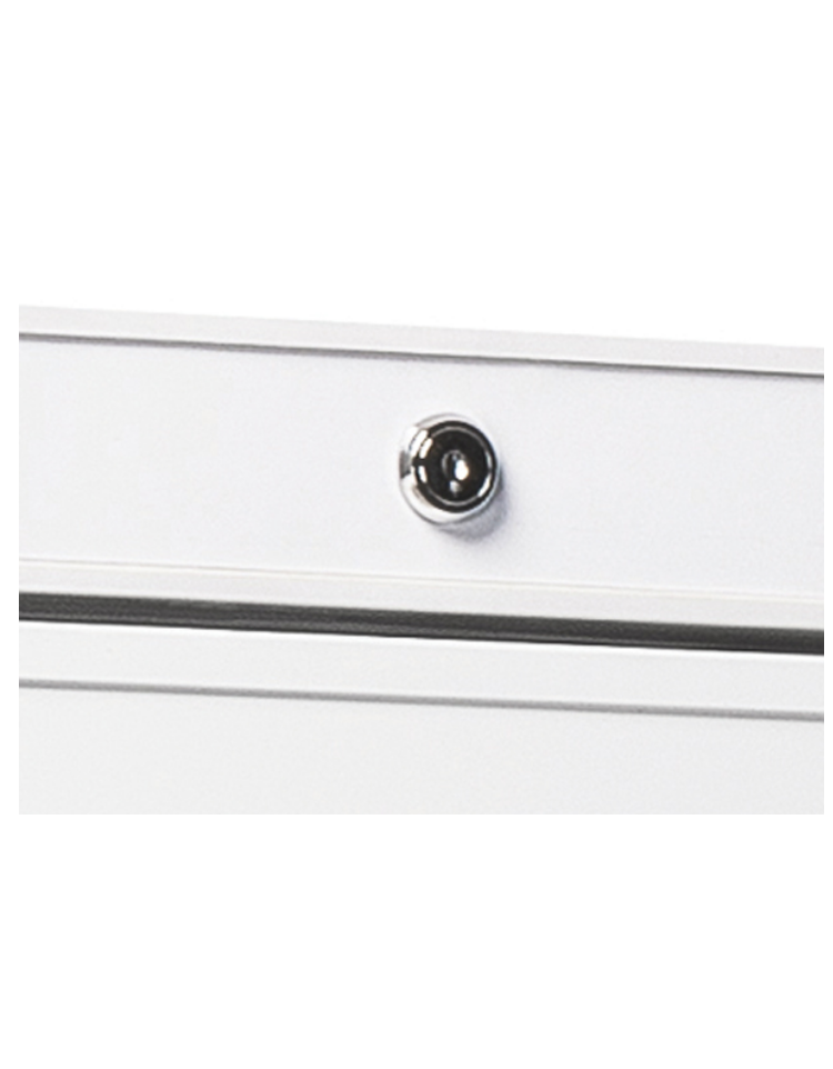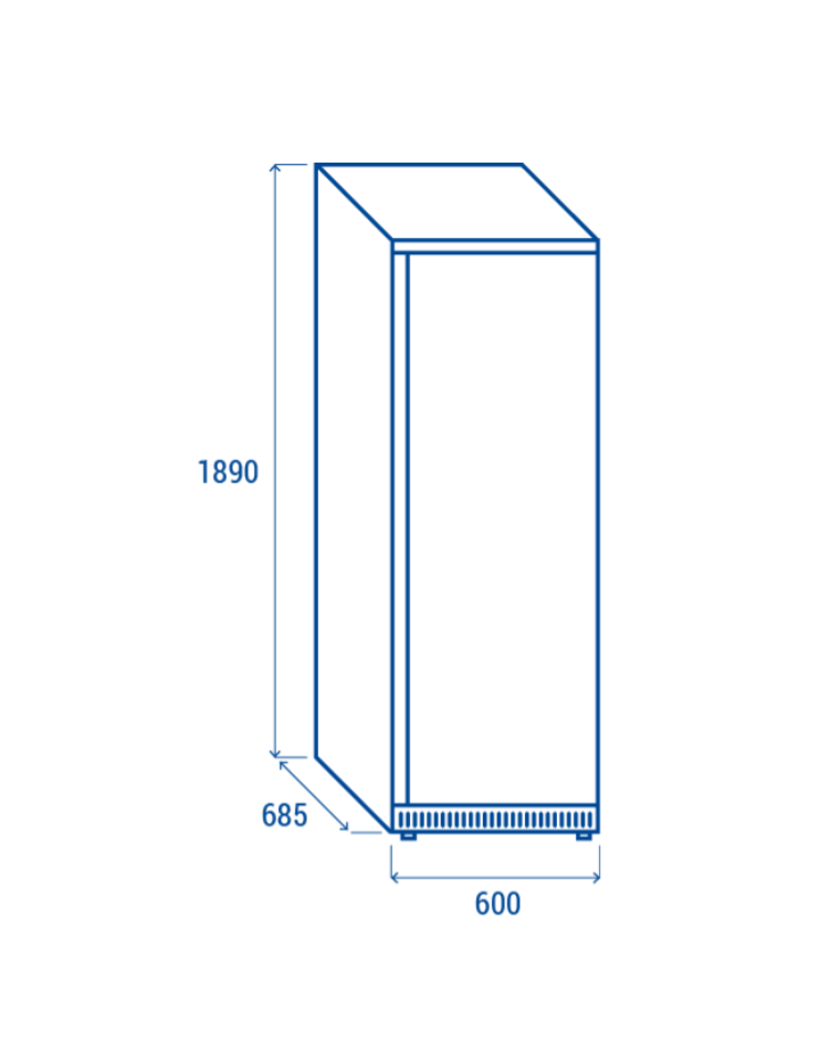 Armadio congelatore in ABS da 400 litri con esterno di colore acciaio e interno in termoformato, dotato di termostato digitale, porta reversibile, serratura, maniglia integrata nel profilo della porta, 6 ripiani evaporatore fissi e 2 piedini regolabili + 2 rotelle posteriori.