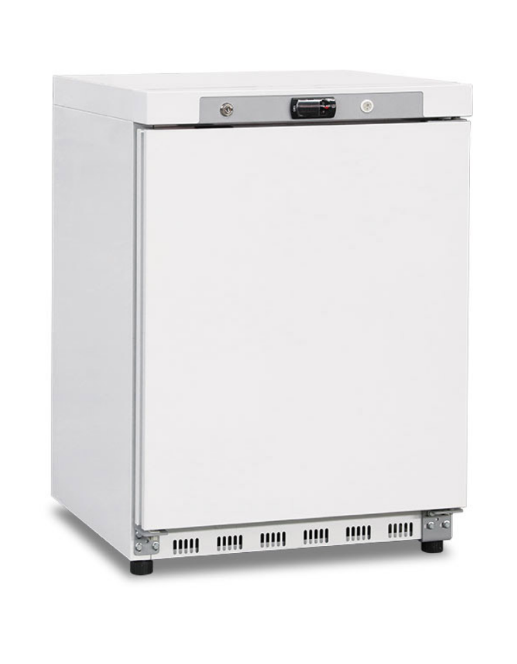 Armadio congelatore in ABS da 200 litri con porta solida, esterno inox e interno in termoformato, dotato di termostato digitale, porta reversibile, serratura e allarme apertura porta, maniglia esterna, 2 ripiani evaporatore fissi + 1 ripiano sul fondo e 2 piedini regolabili + 2 ruote posteriori. Le performance sono assicurate dal gas eco-friendly R600a e dalla schiumatura di 60 mm su ogni lato.