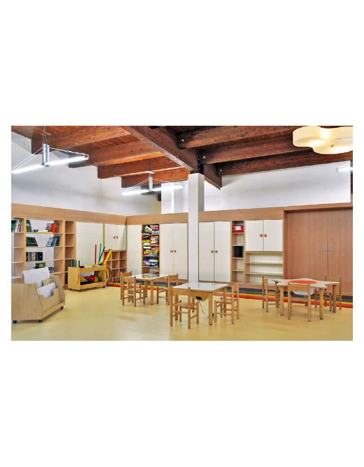 I mobili contenitori compongono un sistema modulare ricco di elementi flessibili e dinamici, in grado di creare angoli e pareti divisorie. La schiena, a vista, è attrezzabile con specchi, pannelli in sughero e lavagne. I mobili sono completamente smontabili e le varie parti che li compongono sono sostituibili separatamente: questa caratteristica prolunga il tempo di utilizzo degli arredi e ne facilita la dismissione a fine ciclo di vita. I bordi, in ABS, sono arrotondati e verniciati al naturale. Le ante sono dotate di feltrini antirumore in battuta e le maniglie sono disponibili sia in legno sia in cuoio antitrauma. Linee pulite e colori chiari per rispondere alle esigenze di una buona pedagogia con un design moderno e minimale. Bordi in rovere sbiancato, ante e ripiani a giorno a filo con la struttura, maniglie essenziali e piedi squadrati rinnovano la linea dei mobili. Tutti possono essere messi su ruote dotate di sistema di bloccaggio. Finitura della struttura e dei piani in laminato color latte antriflesso. Ante a filo per aumentare il pregio estetico e la linearità delle composizioni d’arredo. Nuovo bordo tridimensionale in rilievo, per sottolineare la percezione materica del mobile.