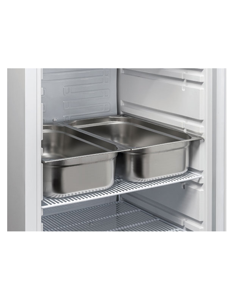 Armadio refrigerato in ABS da 600 litri con porta in vetro con cornice e maniglia di colore acciaio, esterno di colore bianco e interno in termoformato, dotato di termostato digitale, serratura, maniglia integrata nel profilo della porta, 4 ripiani regolabili, 2 piedini regolabili + 2 rotelle posteriori, e adatto per vaschette GN2/1.