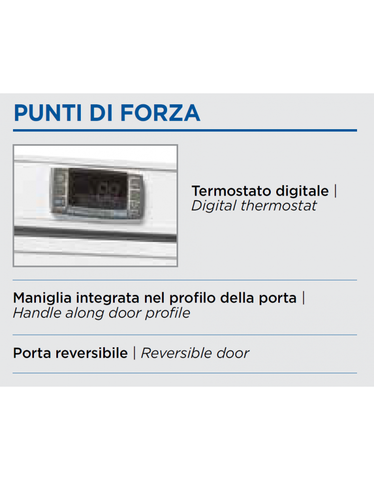 Armadio refrigerato in ABS da 600 litri con esterno di colore bianco e interno in termoformato, dotato di termostato digitale, porta reversibile, serratura, maniglia integrata nel profilo della porta, 4 ripaini regolabili, 2 piedini regolabili + 2 rotelle posteriori, e adatto per vaschette GN2/1.