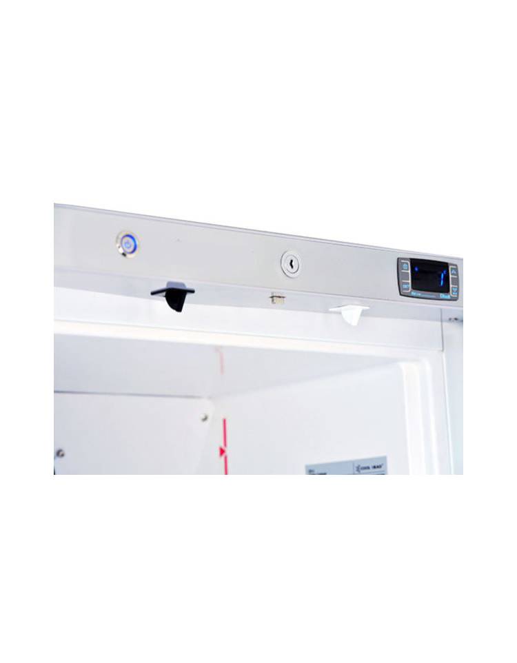 Di colore acciaio e interno in termoformato, il frigo è dotato di termostato digitale, allarme “porta aperta” e “alta temperature”, porta autochiudente e reversibile, serratura, interruttore generale, 5 ripiani regolabili, 2 piedini regolabili + 2 rotelle posteriori, ed è adatto per vaschette GN2/1