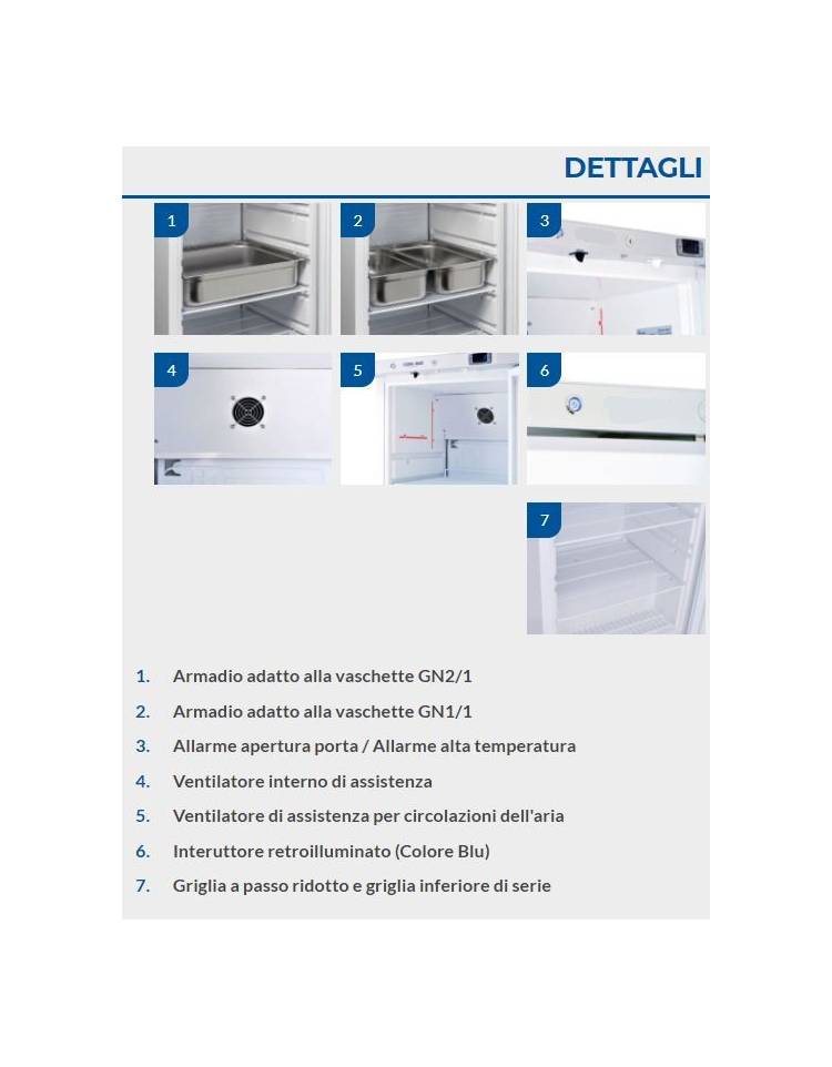 Di colore bianco e interno in termoformato, il frigo è dotato di termostato digitale, allarme “porta aperta” e “alta temperature”, porta autochiudente e reversibile, serratura, interruttore generale, 5 ripiani regolabili, 2 piedini regolabili + 2 rotelle posteriori, ed è adatto per vaschette GN2/1