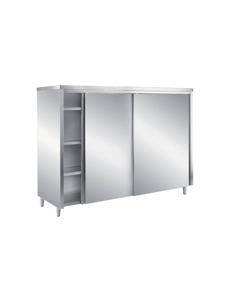 Acciaio inox AISI 304 18/10 satinato fnitura Scotch Brite - Ante scorrevoli autobloccanti a fne corsa - Scorrimento su cuscinetti in nyloan - Ante battenti tamburate - Guida in doppio spessore antitaglio - 4 ripiani rinforzati, 3 intermedi regolabili a doppio spessore con pieghe antitaglio.