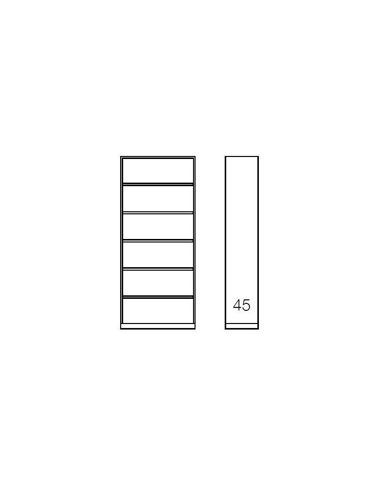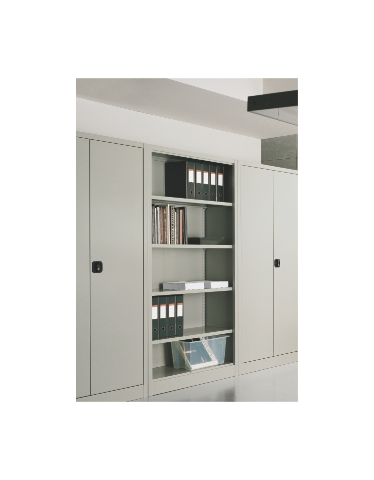 Realizzato con lamiera d'acciaio di 1° scelta con spessore 8/10 mm con particolari di assemblaggio spessore 15/10 mm. Vi sono 4 ripiani spostabili predisposti per l'applicazione di cartelle sospese a lettura verticale, interasse 33 cm. Lo spostamento avviene su cremagliera con passo 30 mm. I fianchi hanno gli spigoli esterni arrotondati raggio 8 mm. E sono incastrati alla base mediante 4+4 ganci metallici ricavati con lo stampaggio della lamiera (spessore 20/10) mentre il cappello è fissato ai fianchi mediante 4 bulloni filettati 8MA. I fianchi sia anteriormente che posteriormente sono tutti raggio 8 mm. e gli spigoli del cappello sono completamente arrotondati. Le schiene sono fissate alla struttura dell'armadio con viti autofilettanti, in modo da garantire la massima rigidità, esse sono posizionabili sia con faccia a vista esterna sia con faccia a vista interna. La verniciatura viene effettuata con polveri epossidiche in forno a 190° C previo trattamento anti corrosione.