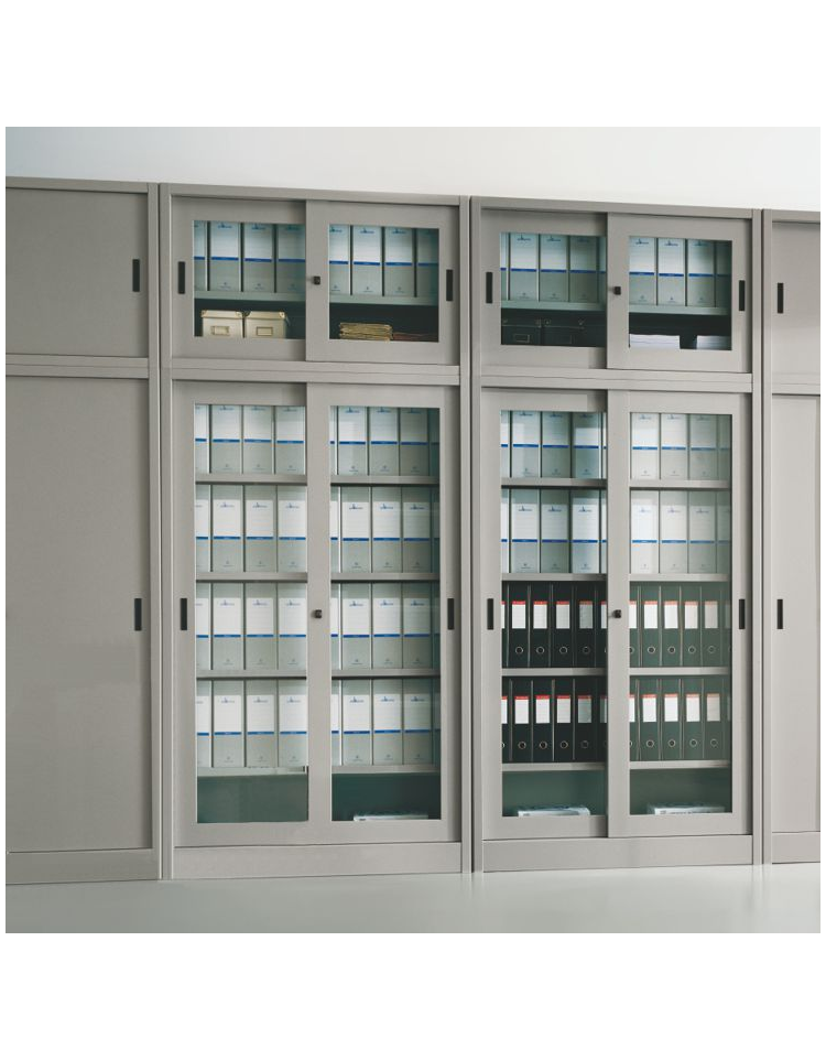 La chiusura posteriore è realizzata in lamiera con un pannello unico mentre per gli armadi di cm. 180 è ottenuta con due pannelli. In entrambi i casi i pannelli sono dotati di fori che ne consentono il fissaggio sia dall’esterno del contenitore che dall’interno, garantendo in questo caso una perfetta rifinitura del mobile e la possibilità di utilizzo degli armadi come elementi divisori. Gli armadi sono corredati di ripiani regolabili in altezza e predisposti per contenere cartelle sospese.
