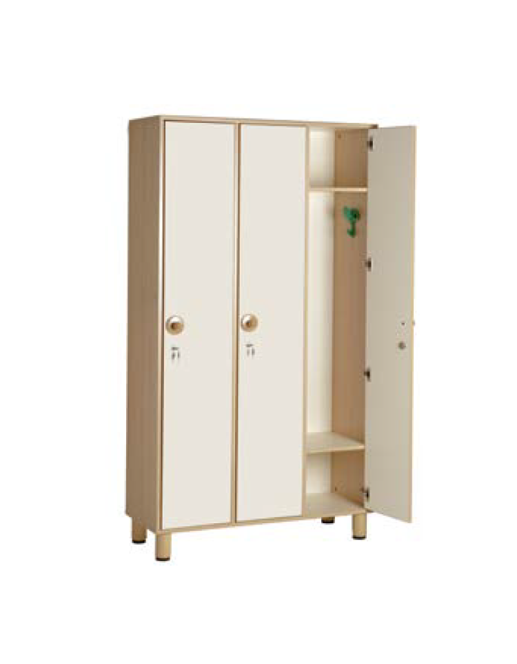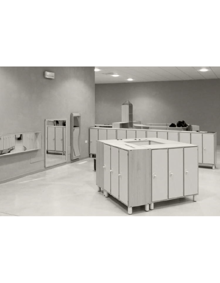 Gli spogliatoi compongono un sistema modulare ricco di elementi flessibili e dinamici, in grado di creare angoli e pareti divisorie. I mobili sono completamente smontabili e le varie parti che li compongono sono sostituibili separatamente: questa caratteristica prolunga il tempo di utilizzo degli arredi e ne facilita la dismissione a fine ciclo di vita. I bordi, in ABS, sono arrotondati e verniciati al naturale. Le ante sono dotate di feltrini antirumore in battuta e le maniglie sono disponibili sia in legno sia in cuoio antitrauma. Linee pulite e colori chiari per rispondere alle esigenze di una buona pedagogia con un design moderno e minimale. Bordi in rovere sbiancato, ante e ripiani a giorno a filo con la struttura, maniglie essenziali e piedi squadrati rinnovano la linea dei mobili. Tutti possono essere messi su ruote dotate di sistema di bloccaggio. Finitura della struttura e dei piani in laminato color latte antriflesso. Ante a filo per aumentare il pregio estetico e la linearità delle composizioni d’arredo. Nuovo bordo tridimensionale in rilievo, per sottolineare la percezione materica del mobile.