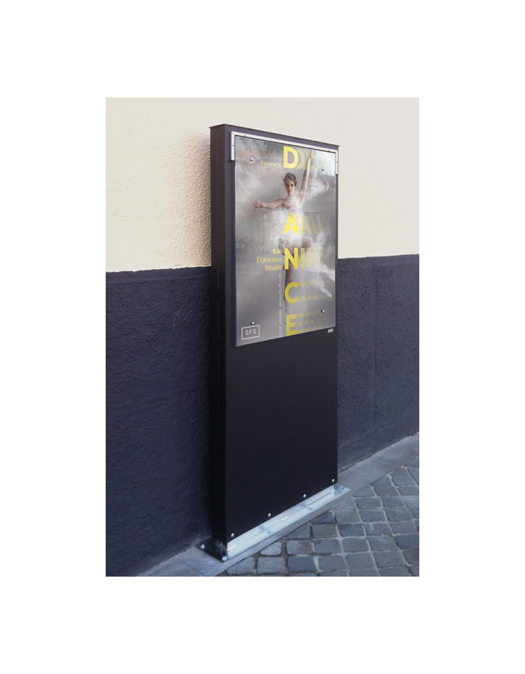 Totem bifacciale in lamiera d’acciaio zincato e verniciato. Fissaggio al suolo tramite zoccolo in acciaio inox con predisposizione per il tassellamento al suolo. Le superfici espositive sono in policarbonato. Completo di gocciolatoio. Pannello in lamiera zincata e verniciata. Il Totem da esterno può essere posizionato all’ingresso di parchi, centri commerciali, teatri o aziende. Grazie al doppio pannello, consente di inserire informazioni, mappe o dati utili da comunicare ai visitatori. Può essere installato anche in piazze, dove, con l’aggiunta di panchine, cestini e portabici, diventa un punto informativo e un’area di sosta o relax.
