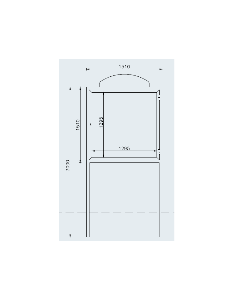 Bacheca composta da supporti e traversa realizzati in tubolare di acciaio accoppiati. Il pannello può essere realizzato con telaio in tubolare quadro e al quale viene rivettata una lamiera oppure con un profilo perimetrale in tubolare con anta apribile in profilo di allumino e vetro antisfondamento stratificato, chiusura con serratura a chiave universale. Tutte le parti metalliche sono zincate e verniciate.