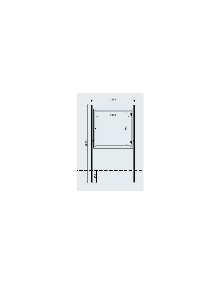 Il telaio della bacheca, fissato ai supporti attraverso 4 tubolari (2 per ciascun lato), è formato da uno scatolato in lamiera con anta apribile in profilo di alluminio estruso (con guarnizioni in gomma a tenuta stagna) e vetro antisfondamento stratificato 3+3mm con la chiusura con serratura a chiave universale.
