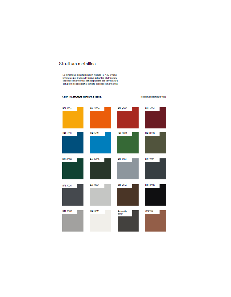 Tutte le parti metalliche sono zincate e verniciate a polveri poliestere termoindurenti nelle diverse colorazioni RAL. La viteria è in acciaio inox.