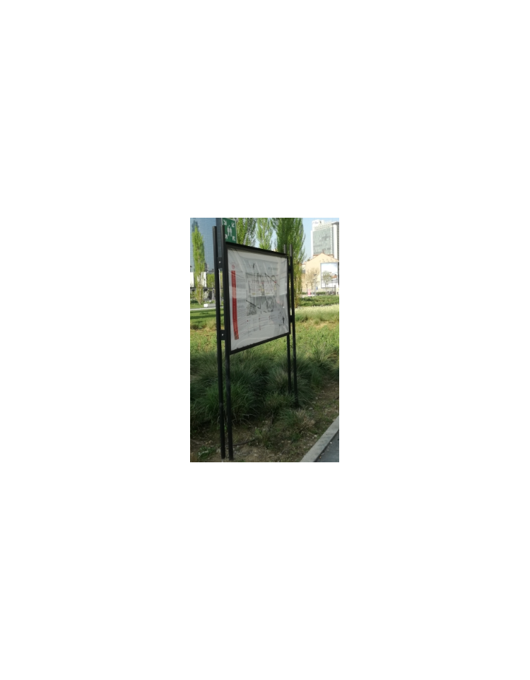 La bacheca è composta da due supporti in acciaio realizzati con tubolari D.40 mm collegati tra loro tramite piastrine saldate.