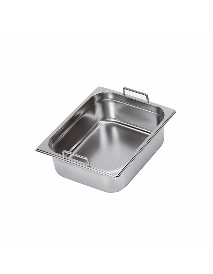 Bacinella contenitore GN 1/1 in acciaio inox con maniglie fisse, impilabile.