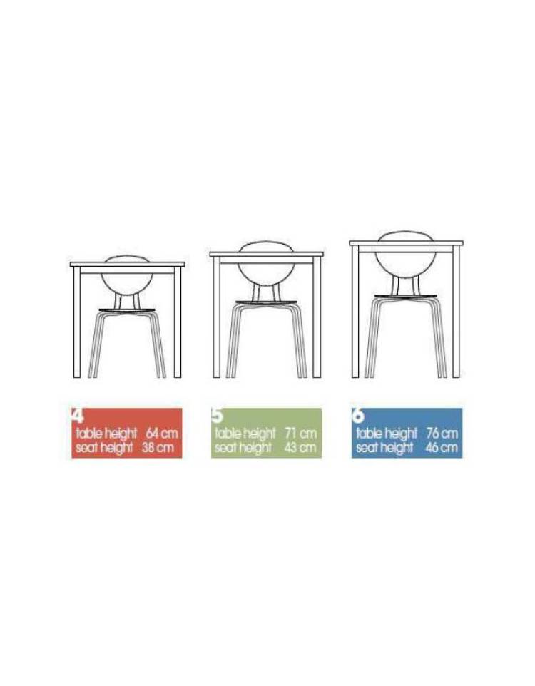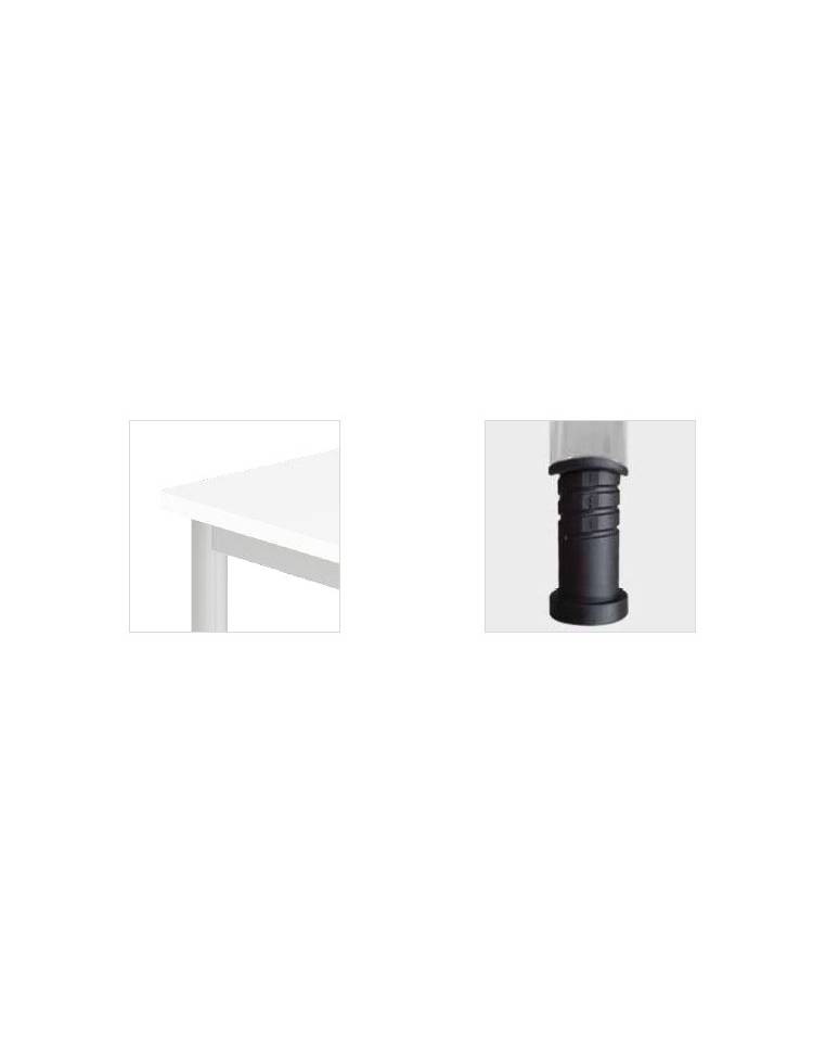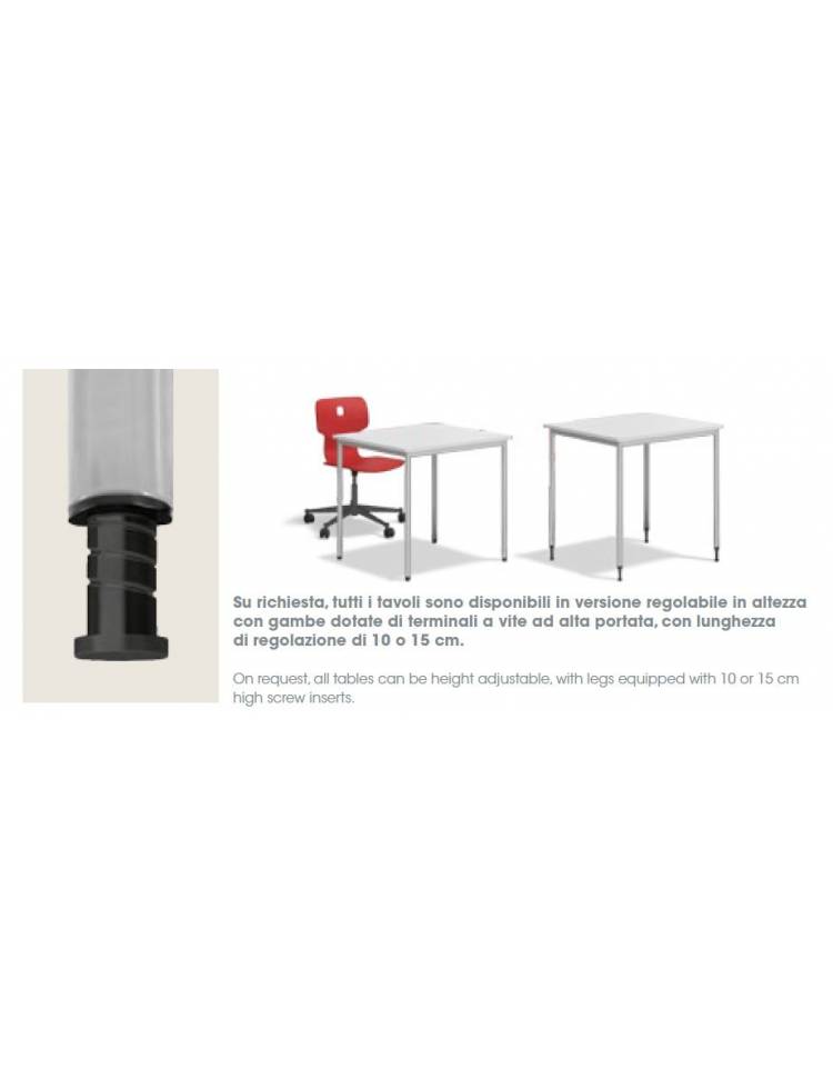 Elementi semplici per combinazioni complesse. I tavoli educational sono parti di configurazioni variabili e dinamiche. Dimensioni e geometrie dei componenti del sistema sono coordinati per consentire l'accostamento anche di elementi di forme diverse. Postazioni individuali compongono tavoli per piccoli e grandi gruppi, per riunioni e lavoro cooperativo. La gamma di colori per strutture metalliche e piani è coordinata con quella del sistema dei contenitori. Il piano del tavolo è realizzato in pannelli di nobilitato ecologico certificato FSC, in classe E1 di emissione di formaldeide da mm 25 di spessore, i bordi sono realizzati in Abs da mm 2 di spessore, in tinta con la struttura e arrotondati nel rispetto della normativa di sicurezza vigente. La struttura metallica è costituita da 4 montanti in tubo di acciaio con diametro mm 40x1,5 di spessore, collegati sotto il piano con traverse a sezione rettangolare da mm 40x20x 1,5 di spessore. Tutte le saldature sono a filo continuo, la verniciatura è ottenuta con polveri epossidiche previo trattamento di sgrassaggio e fosfatazione con passaggio in tunnel termico a 180°. Il fissaggio tra il piano di lavoro e la struttura, avviene tramite viti ad ala larga passanti su piastrine in lamiera stampata saldate alla struttura a contatto con il piano. Alla base delle quattro gambe, sono collocati dei terminali a vite ad alta portata, con lunghezza di regolazione di 10 o 15 cm.