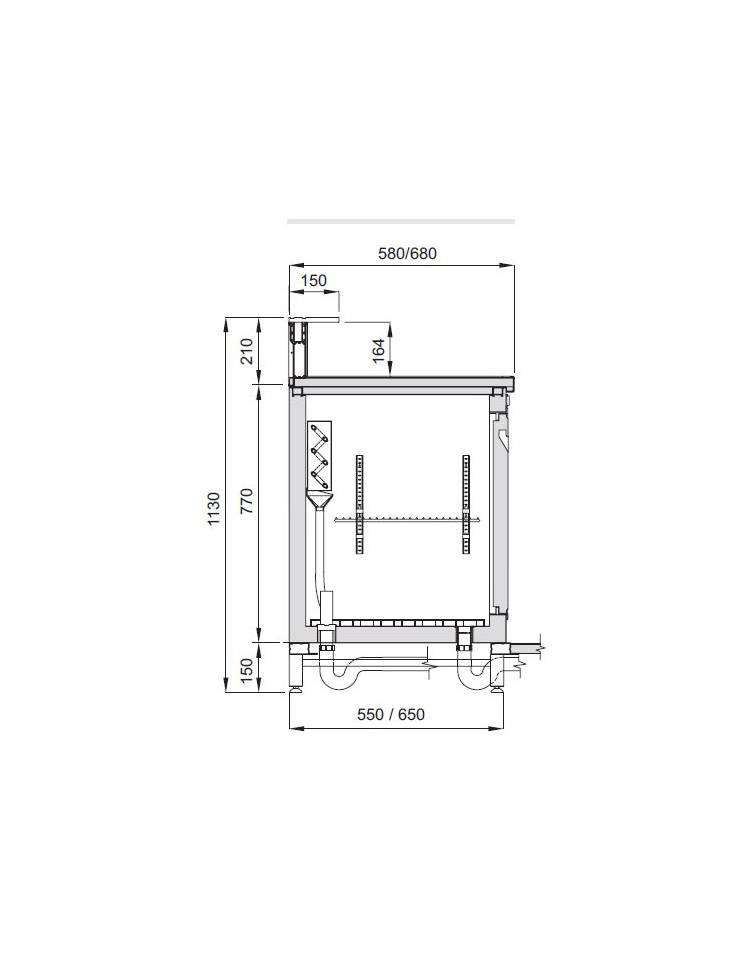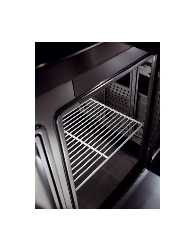 DOTAZIONE STANDARD: Piletta di scarico condensa, cremagliere interne, reggipiani, griglia intermedia in filo plastificata, griglia di fondo in plastica, sportelli in acciaio inox con chiusura magnetica e guarnizione, quadro comandi con termostato elettronico ed interruttore generale, coperchio coibentato, cavalletti in metallo verniciato a polveri epossidiche con piedi regolabili, predisposizione per appoggia pedana, top in acciaio inox. Luce interna con lampada a LED.