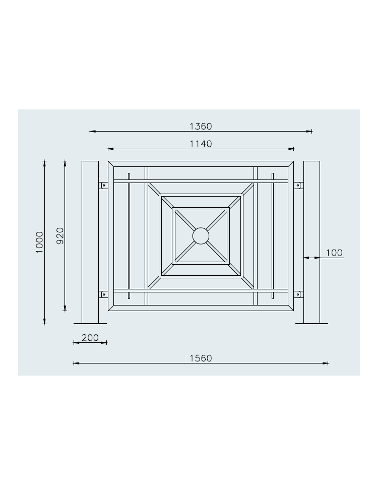 La barriera è composta da due sostegni in tubolare di acciaio sez. 10x10 cm con flangia alla base 200 mm Senza fori per la versione da inghisare per una profondità di 200 mm o con fori per fissaggio al suolo tramite tasselli ad espansione. Tutte le parti metalliche sono zincate e verniciate a polveri poliestere termoindurenti secondo le diverse colorazioni RAL.