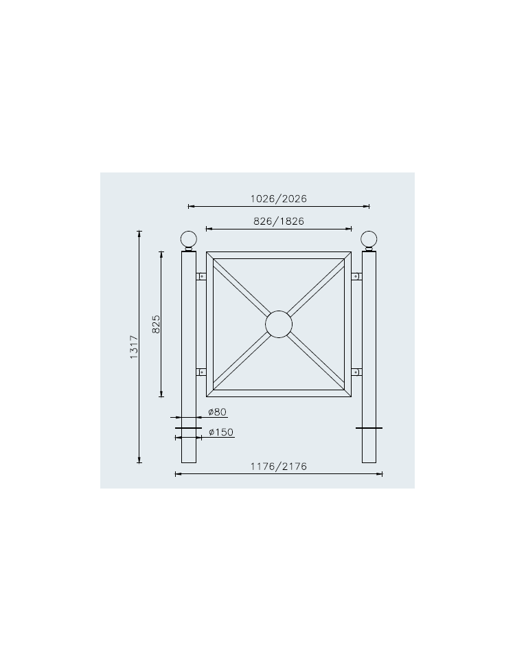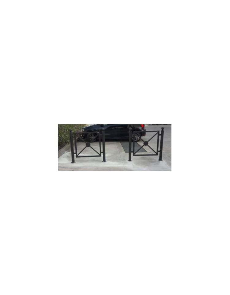 La barriera è composta da due sostegni in tubolare di acciaio Ø 80x2 con sovrastante borchia Ø40 e sfera in acciaio forgiato Ø90mm. La pannellatura viene unita ai sostegni con viteria in acciaio inox, composta da un telaio perimetrale L.825XH.825 o L.1825XH.825 mm in tubolare quadro 40x1,5 e crociera in piatto 30x10, con nodo centrale costituito da un piatto Ø152 sp.10mm. Il pannello a croce può essere rivestito con un pannello in lamiera 12/10 su cui può essere affissa la pubblicità.