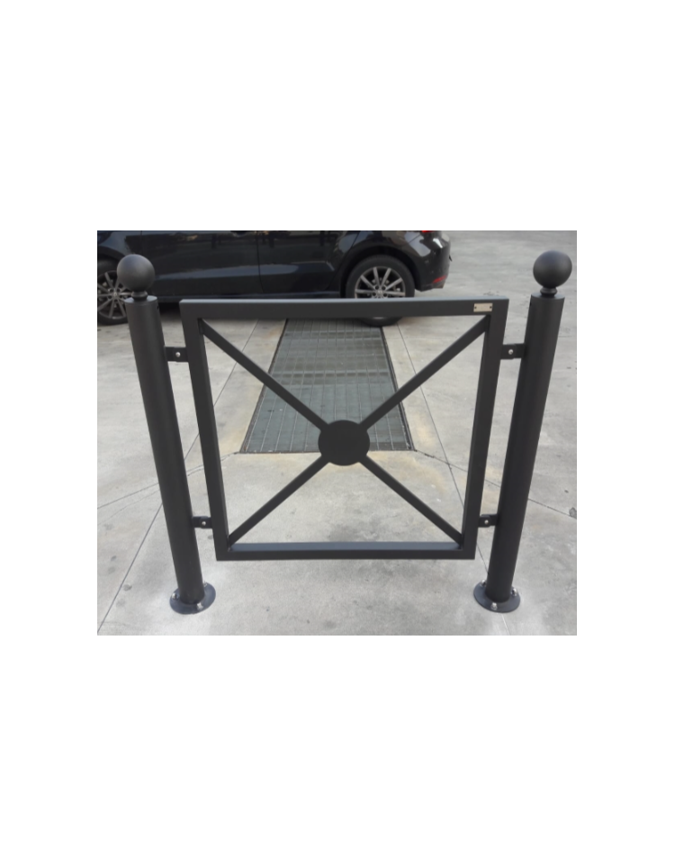 La barriera è composta da due sostegni in tubolare di acciaio Ø 80x2 con sovrastante borchia Ø40 e sfera in acciaio forgiato Ø90mm. La pannellatura viene unita ai sostegni con viteria in acciaio inox, composta da un telaio perimetrale L.825XH.825 o L.1825XH.825 mm in tubolare quadro 40x1,5 e crociera in piatto 30x10, con nodo centrale costituito da un piatto Ø152 sp.10mm. Il pannello a croce può essere rivestito con un pannello in lamiera 12/10 su cui può essere affissa la pubblicità. Può essere sia da inghisare che da tassellare con basi quadre 150x150 sp.5mm o tonde D.150 mm sp.5mm provviste di n.4 fori per tasselli ad espansione per il