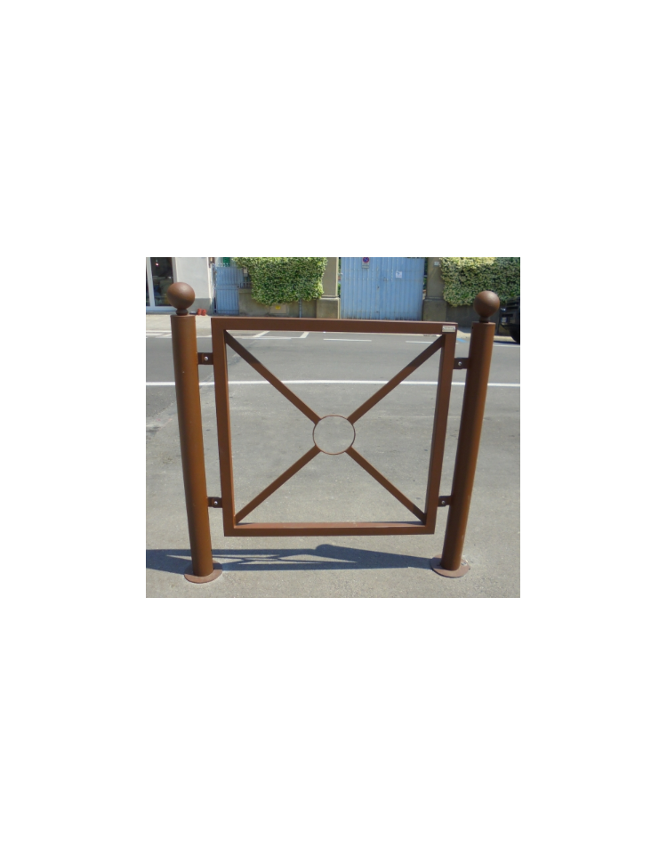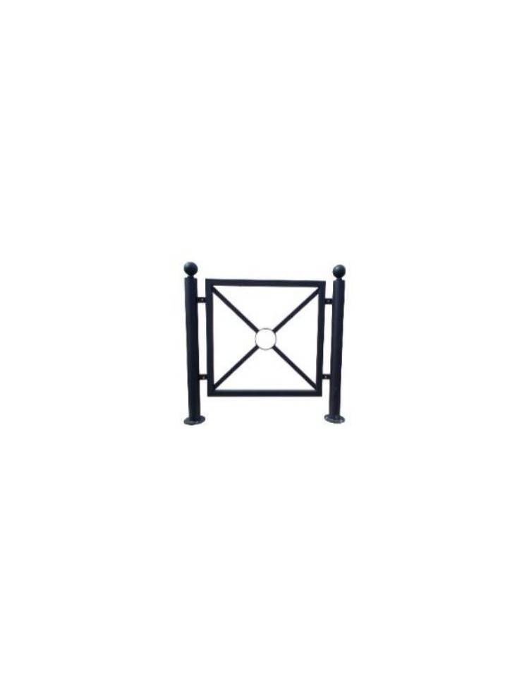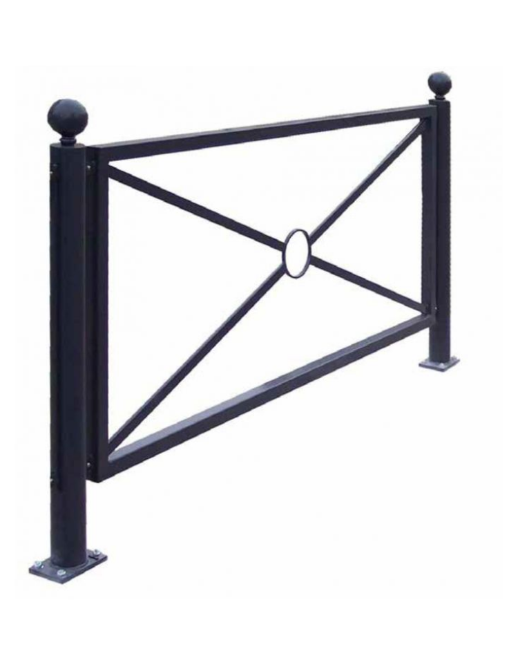 La barriera è composta da due sostegni in tubolare di acciaio Ø80x2 con sovrastante borchia Ø40 e sfera in acciaio forgiato Ø90mm. La pannellatura è unita ai sostegni con viteria in acciaio inox ed è composta da un telaio perimetrale L.825XH.825 o L.1825XH.825 mm in tubolare quadro 40x1,5 e da una crociera in piatto 30x10 con nodo centrale costituito da un anello tondo Ø152 sp.10mm. La barriera può essere fornita modulare o singola. Tutte le parti metalliche sono zincate e verniciate a polveri poliestere termoindurenti secondo le diverse colorazioni RAL. Può essere sia da inghisare che da tassellare (con basi quadre 150x150 sp.5mm o tonde D.150 mm sp.5mm provviste di n.4 fori per tasselli ad espansione per il fissaggio al suolo) ed il pannello a croce può essere rivestito con un pannello in lamiera 12/10 su cui può essere affissa la pubblicità. Usata a protezione di marciapiedi vicino agli incroci o per piste ciclabili, interne o esterne all’area urbana.