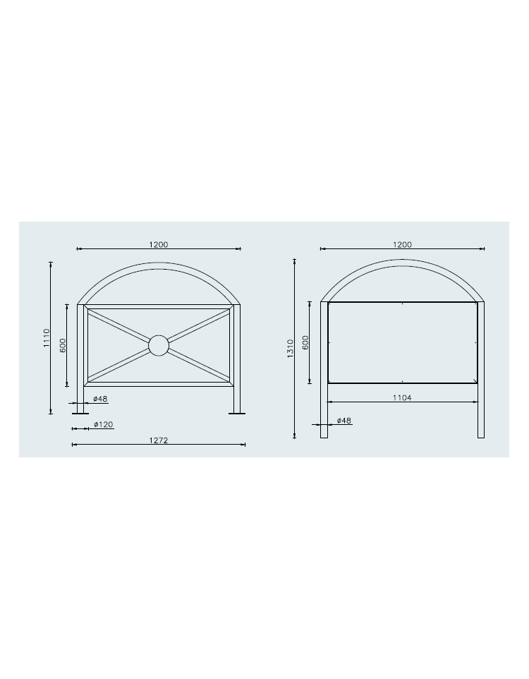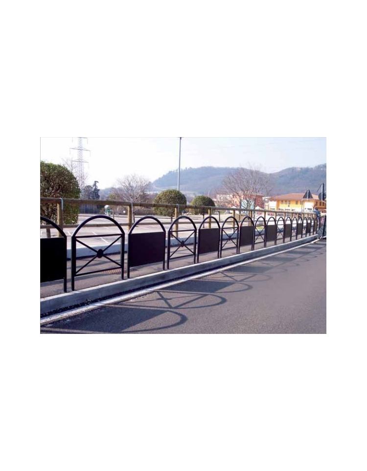 Barriera parapedonale realizzata da 2 montanti e un arco superiore in tubolare d’acciaio Ø 48x2. Il pannello centrale è costituito da un telaio perimetrale in tubolare d’acciaio a sezione quadra 30x1,5 e una crociera in piatto 30x4 con un nodo centrale formato da un tondo pieno di acciaio D.150 sp.4mm. Può essere predisposta anche per portare pannello pubblicitario. La barriera può essere inghisata oppure predisposta con piastre base per il fi ssaggio al suolo tramite tasselli ad espansione. Tutte le parti sono zincate e verniciate con polveri poliestere termoindurenti nelle diverse colorazioni RAL.