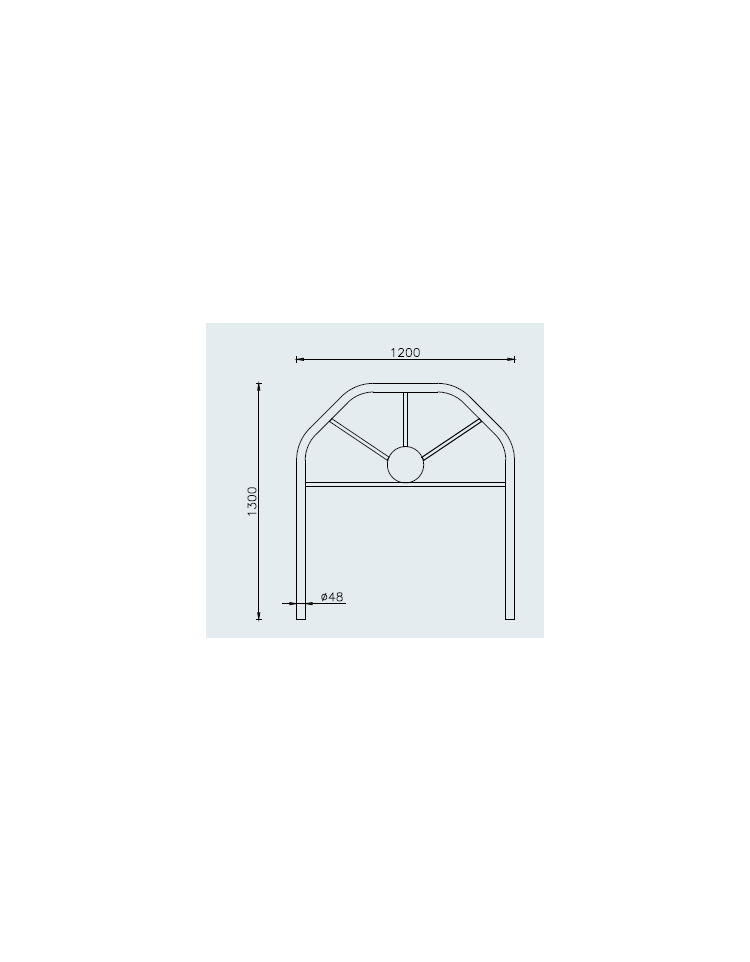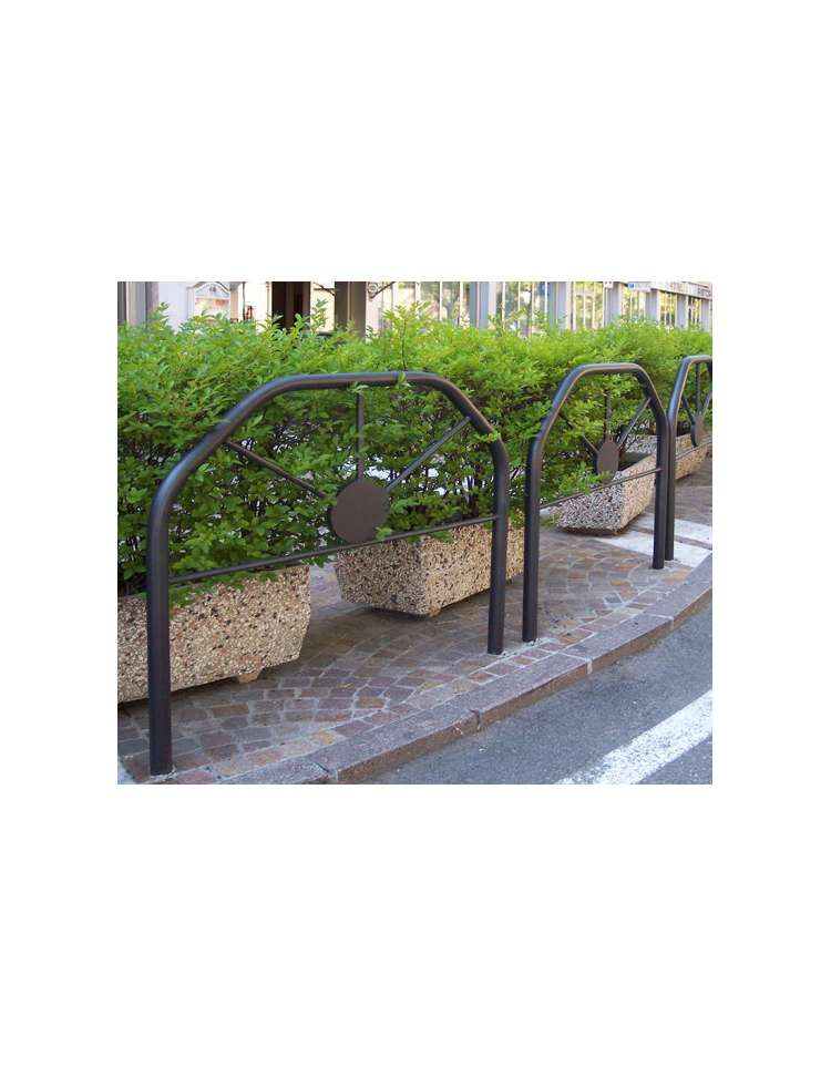 Barriera parapedonale realizzata mediante la piegatura a freddo di tubo in acciaio zincato a caldo e verniciato, diametro mm. 48×2, con traversi di collegamento in tondo d.cm. 2 e da un disco centrale di d.cm. 20 utilizzabile come portalogo per applicare lo stemma del comune o Ente di competenza.
