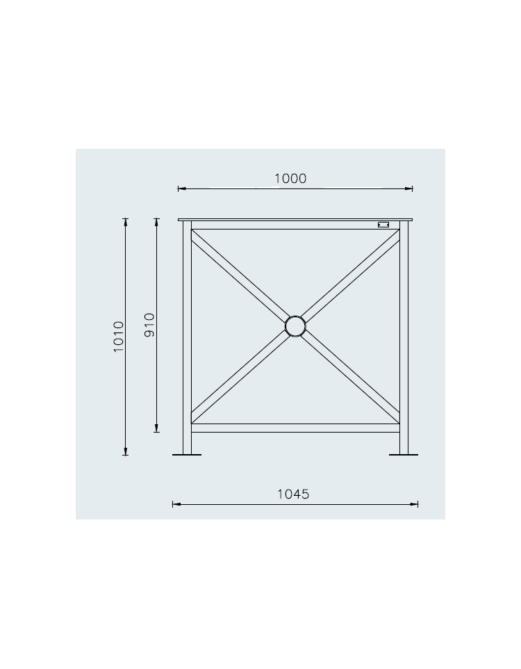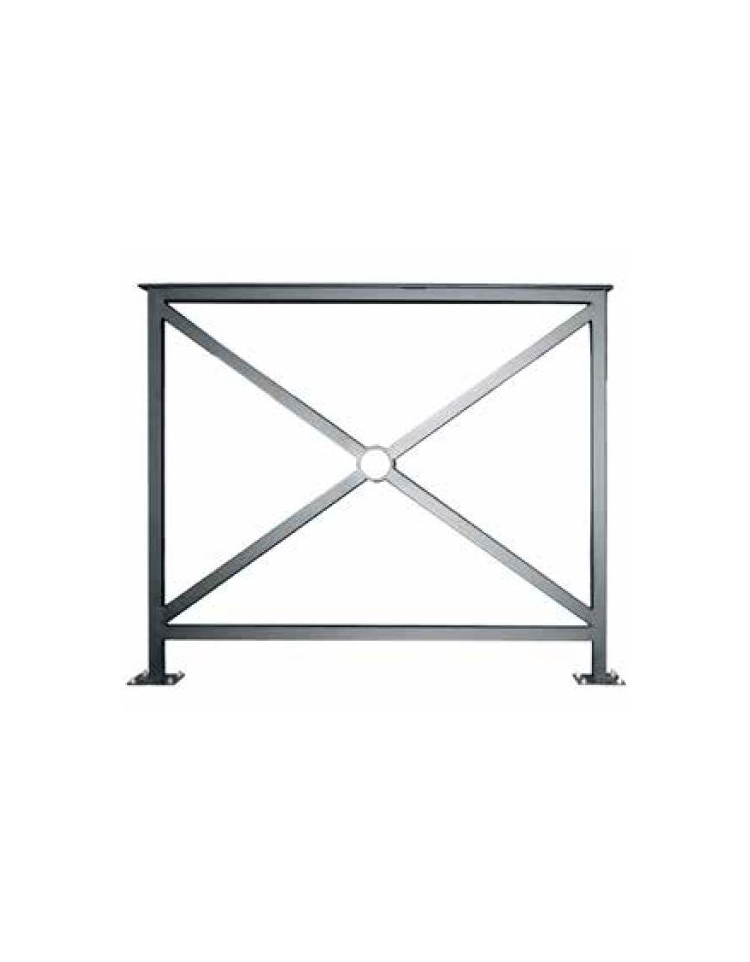La barriera è realizzata da un telaio perimetrale e crociera centrale con elementi in tubolare quadro 35x2. Il nodo centrale è realizzato con un anello in tubo tondo 89x4 mm spessore 35 mm. La barriera è fornita di “corrimano” in acciaio mezzotondo 50x10. Tutte le parti metalliche sono zincate secondo normative UNI e verniciate a polveri poliestere termoindurenti nelle diverse tonalità Ral. Può essere inghisata o tassellata al suolo con apposite basi quadre 120x120 predisposte di fori per tasselli ad espansione. Può su richiesta essere adattata per portare pannello pubblicitario.