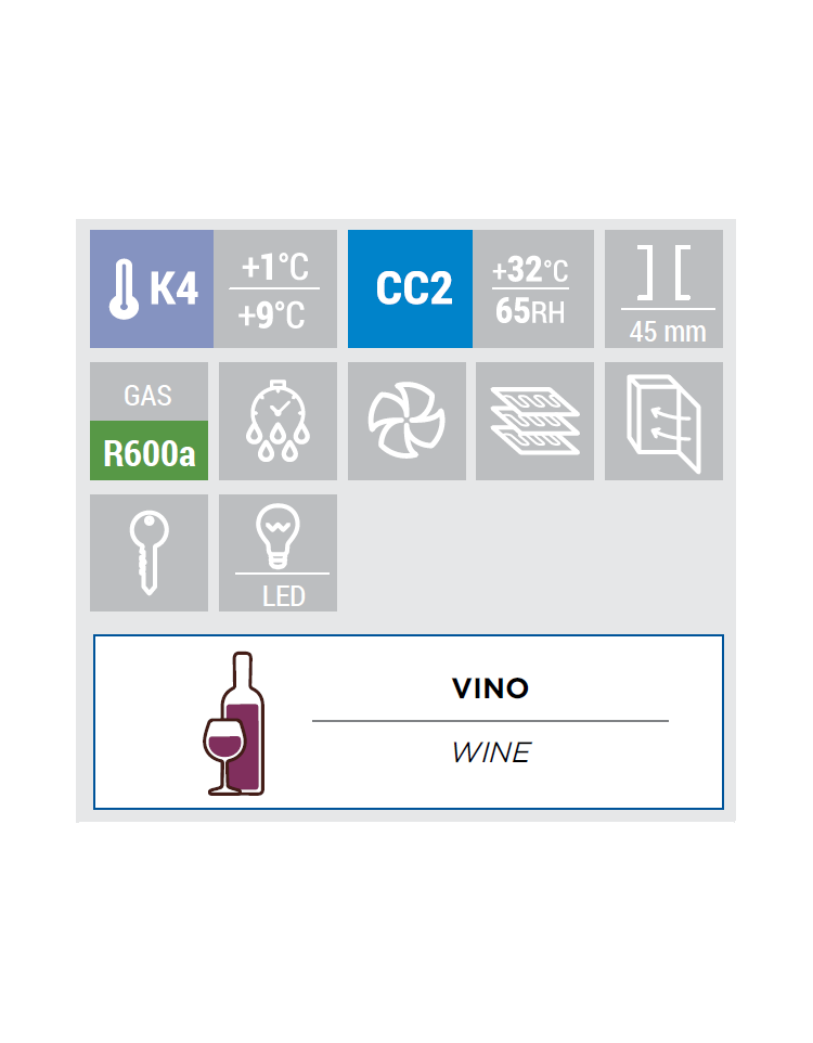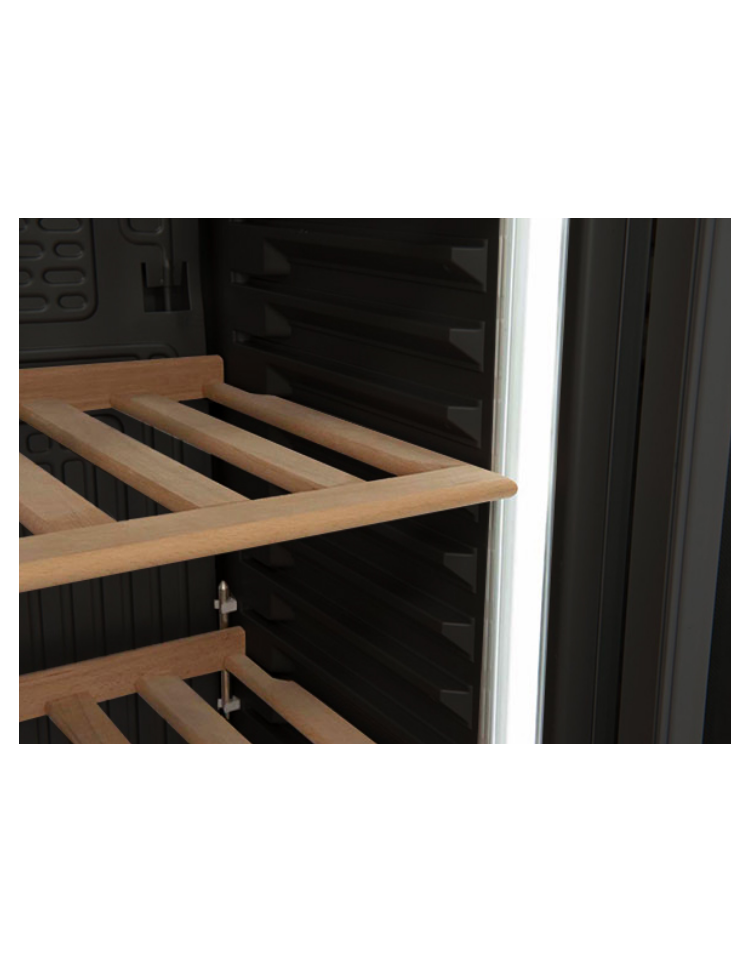 Il modello è stato progettato per essere un’affidabile cantinetta vino mono-temperatura, perfetta per mantenere la giusta temperatura e per esporre le bottiglie di vino. Con una capacità di 350L, disponibile in colore nero per l’interno e per l’esterno, questo prodotto è dotato di una doppia illuminazione verticale a LED, termostato digitale, 6 ripiani regolabili in legno, porta autochiudente frameless con doppio vetro temperato di sicurezza piatto.