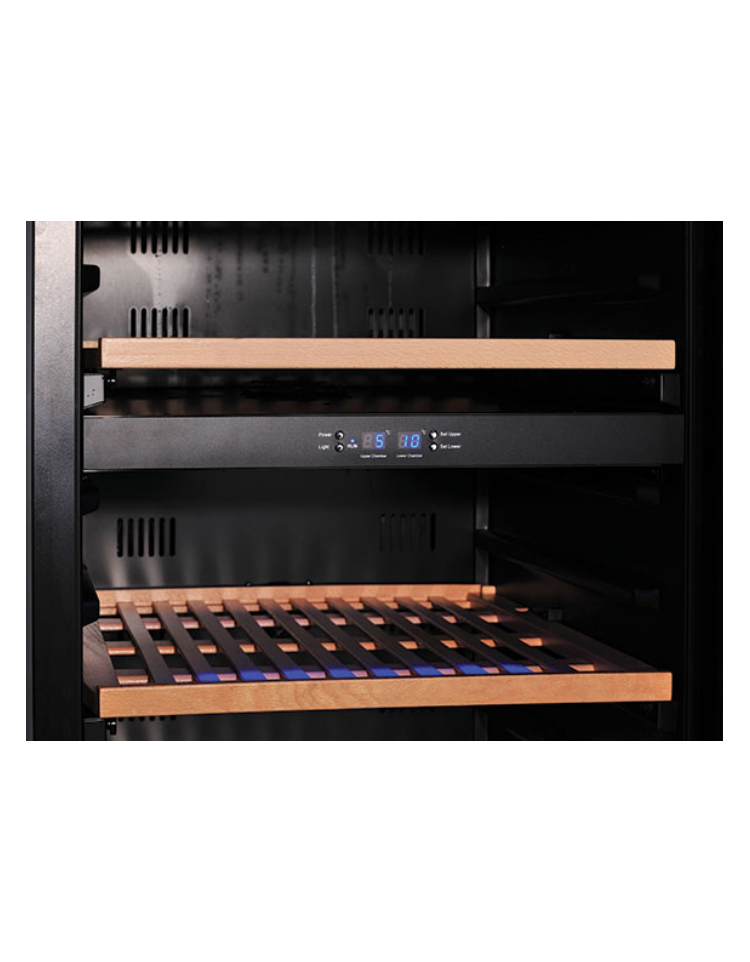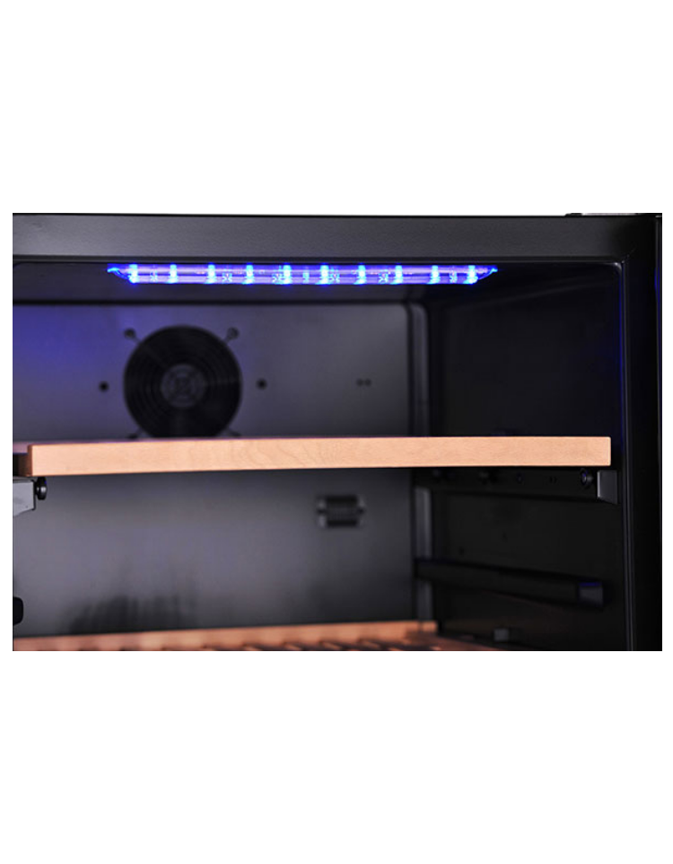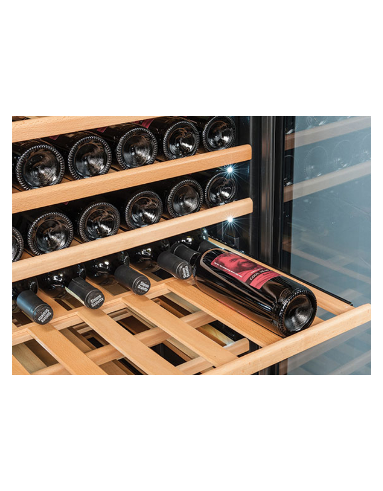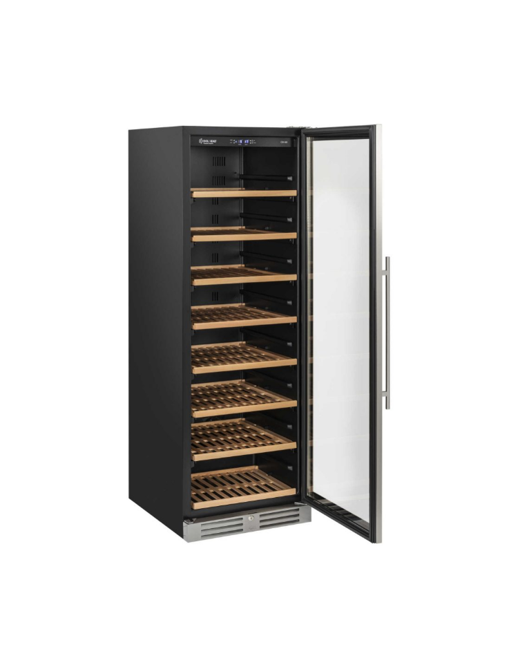 Il modello è una moderna cantinetta mono temperatura adatta a contenere fino a 165 bottiglie, ed è progettata e realizzata con la massima cura e attenzione al fine di ottenere prestazioni avanzate ed elevati standard qualitativi. Questa cantinetta professionale è equipaggiata con 8 ripiani in legno, display digitale e luce interna LED di colore blu, porta reversibile con maniglia cilindrica verticale, serratura, vetro scuro per la protezione del vino e allarme apertura porta.