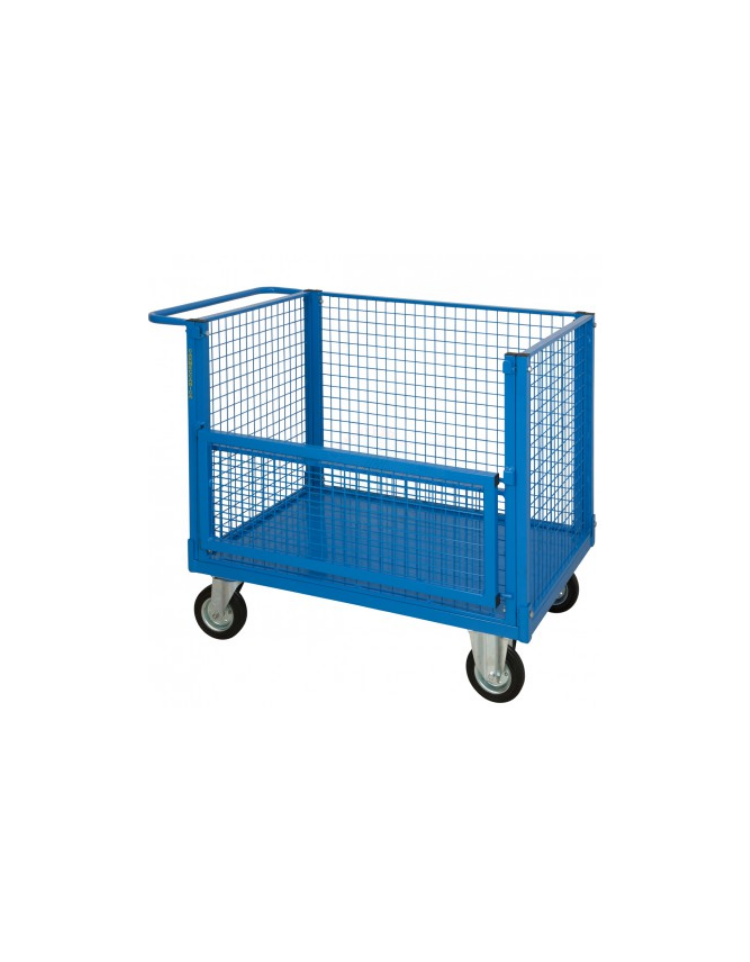 Carrello con pianale a 4 sponde in rete una parzialmente ribaltabile