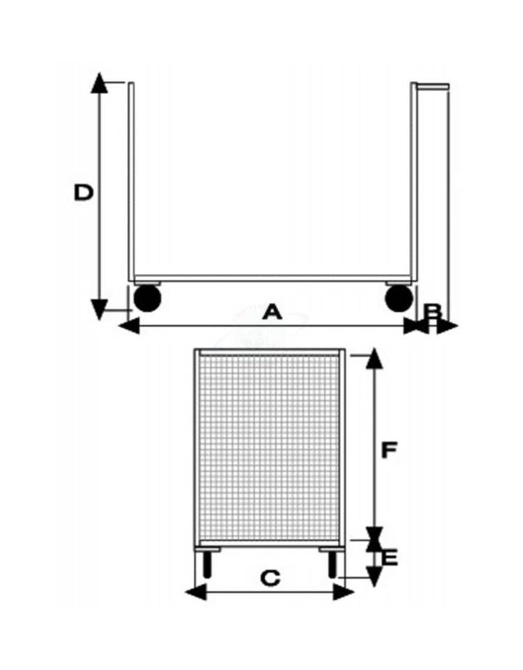 Carrello con pianale con 2 sponde in rete - 4 ruote girevoli Ø cm 14 in gomma industriale, 2 con freno - cm 60x90x81h