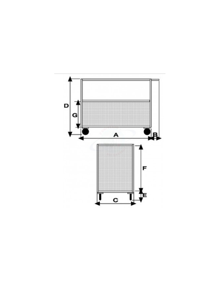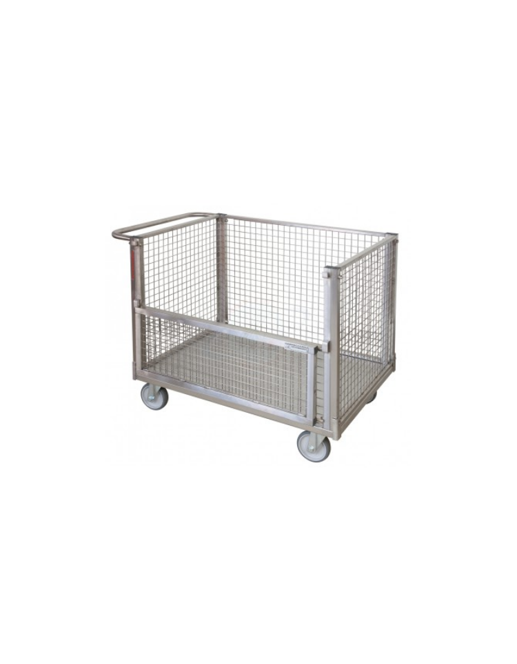 Carrello con pianale in acciaio inox - 4 sponde in rete, 1 ribaltabile - 4 ruote antitraccia (2 fisse - 2 girevoli con freno)
