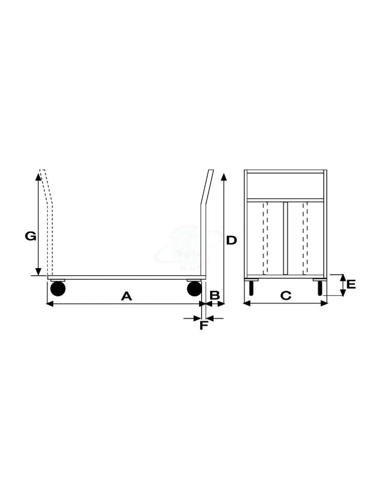 Carrello con pianale in lamiera 15/10 - 4 ruote ( 2 fisse-2 girevoli) in gomma piena, 2 con freno Ø cm 12,5 - pianale cm 50x80