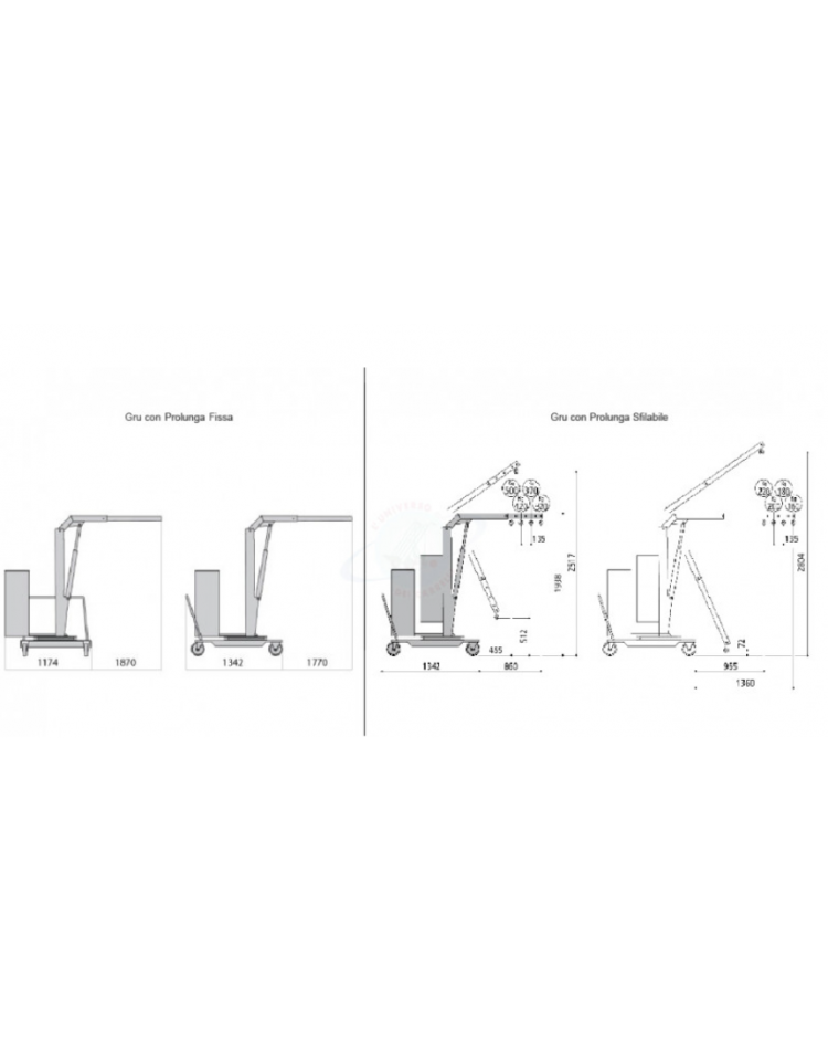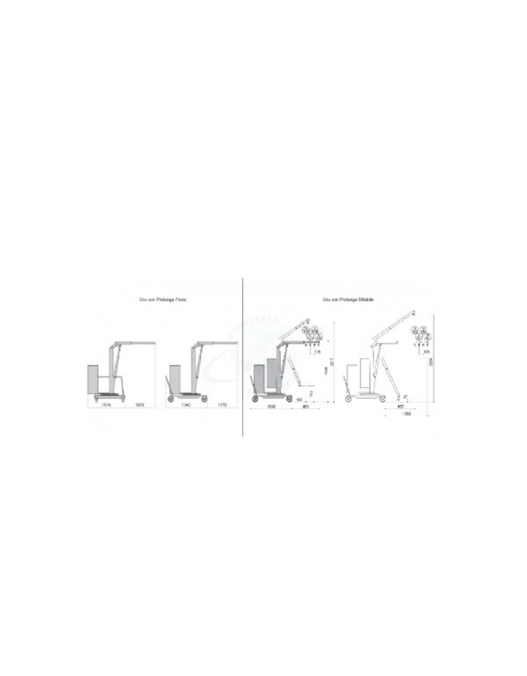 Carrello gru elettrica idraulica zavorrata, girevole a 360° - 4 Ruote (2 girevoli c/freno) portata Kg 500 - Sbraccio max cm 136