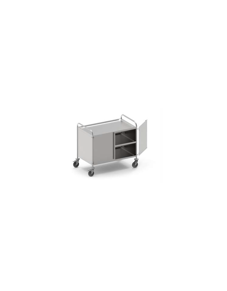 Carrello di servizio inox AISI 304 a piani stampati saldati, pannellato su tre lati e provvisto di sportelli frontali