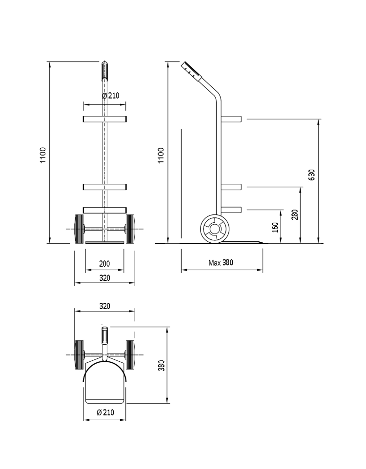 Carrello portabombola da Ø cm 210 lt.15/20 - 2 ruote cm Ø15 in gomma - cm 32x38x110h