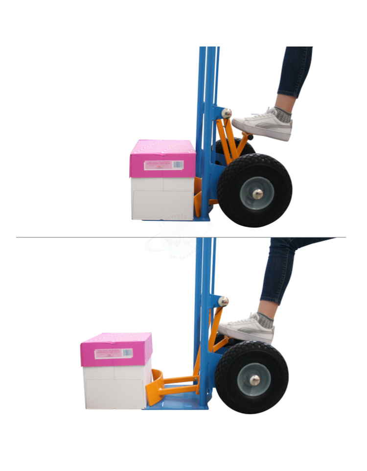 Il carrello facilita lo scarico della merce, riduce la fatica e accorcia i tempi di movimentazione. Azionando la leva scricatrice, il carico scivola sulla piastra e viene "scaricato" a terra. Appoggido il carico a muro e azionando la leva, il carrello si sfila e il crico è perfettamente posizionato a filo muro!