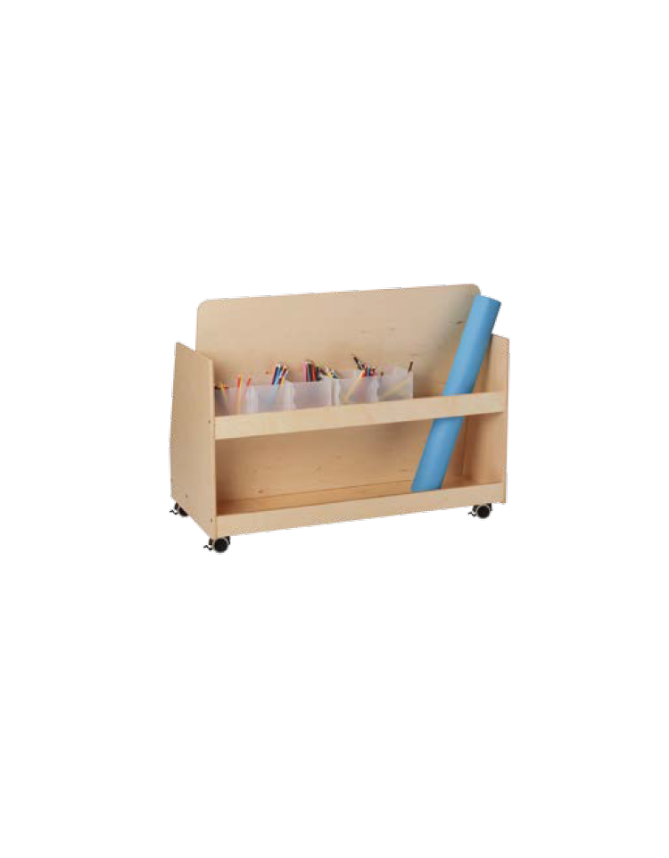La struttura composta dalle fiancate, dalla base e dalle spondine dei vassoi e dei ripiani estraibili è realizzata in pannelli di legno multistrati di betulla in classe E1 di emissione di formaldeide da mm 15 di spessore, i pannelli sono trattati con lucidatura tramite vernici trasprenti atossiche a base d'acqua. Tutti i bordi e gli spigoli sono a vista, lucidati al naturale e arrotondati nel rispetto della normativa di sicurezza vigente. Il carrello è dotato di 4 divisori verticali removibili a differenti altezze dotati di due asole passanti che ne facilitano la presa e il sollevamento. Nella parte alta delle fiancate è collocata una fresata passante che funge da maniglia per facilitare lo spostamento del carrello. L'assemblaggio è ottenuto tramite sistema meccanico di bussole e tiranti eccentrici, coadiuvati da incastri con spinotti in legno. L'appoggio a terra è ottenuto tramite l'utilizzo di 4 ruote piroettanti di cui 2 dotate di leva freno di sicurezza, sistema di rotazione con cuscinetti a sfera, realizzate in nylon con corona interna di irrigidimento, altezza complessiva mm 100.