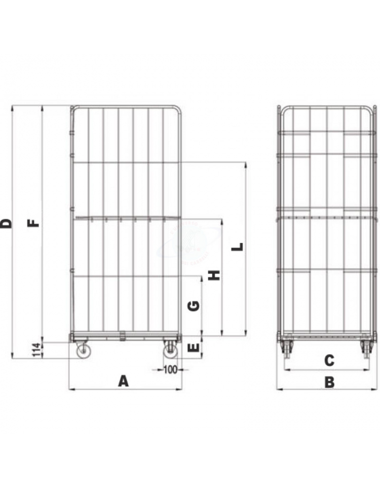 Carrello roll container Maxi - base con 4 ruote polipropilene (2 fisse - 2 girevoli) e 2 sponde laterali - cm 120x80,5x180h