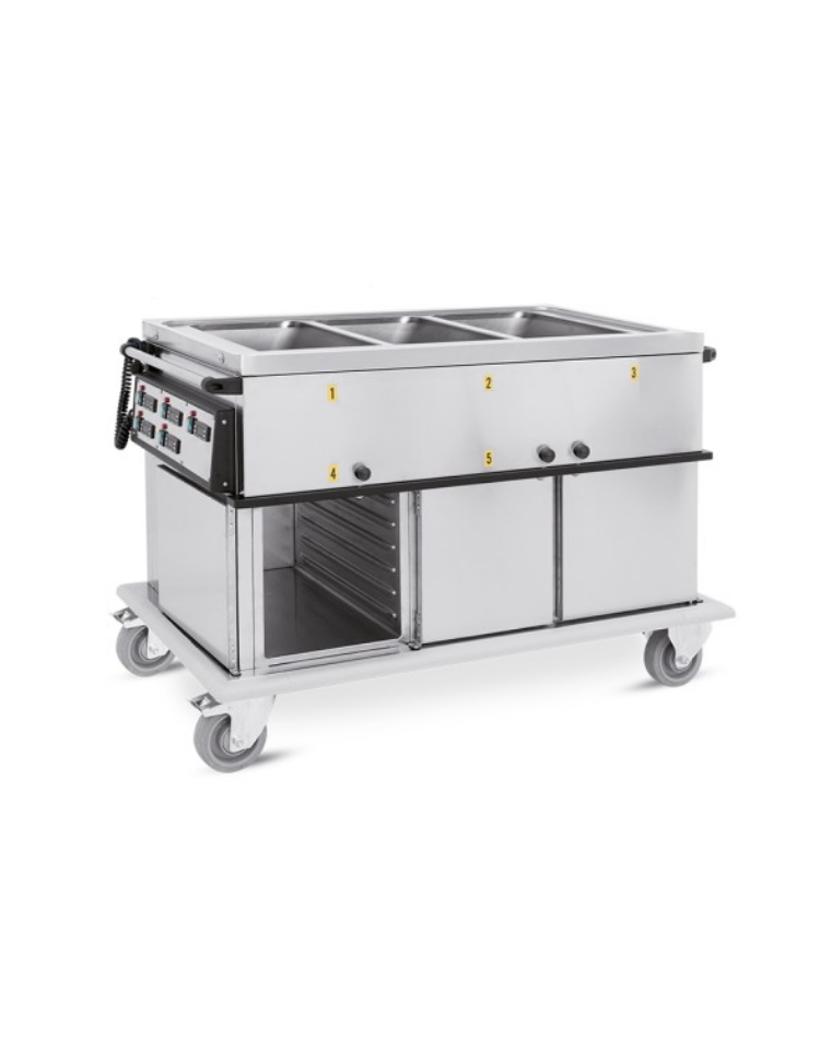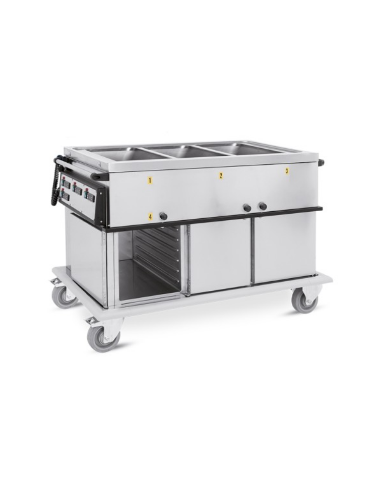 Carrello termico armadiato-vasca unica, coperchi a ribalta 3x1/1GN inox 18/10 AISI 304 - 3 vani (1 riscaldato) -cm 126,5x70x107h