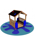 Certificato in conformità delle Norme Europee EN 1176 dall’Istituto Tedesco TÜV - SÜD. Realizzata in legno di pino nordico impregnato in autoclave con sali atossici. Costituita da N° 4 montanti in legno di pino nordico lamellare sez. mm 70 x 70 collegati tra loro da n° 2 ringhierine di tavole di pino nordico e tetto a due falde realizzato in multistrato di legno filmato (carply) completo di decorazioni in HPL dai colori vivaci pantografati e con spigoli arrotondati; N° 4 pannelli tamponamento di bilaminato stratificato HPL dai colori vivaci pantografati e con spigoli arrotondati collegano le due panchette realizzate con multistrato di legno filmato (carply). Assemblaggio mediante bulloneria in acciaio zincato 8.8 e dadi autobloccanti. Elementi copridado a norma in nylon colorato.