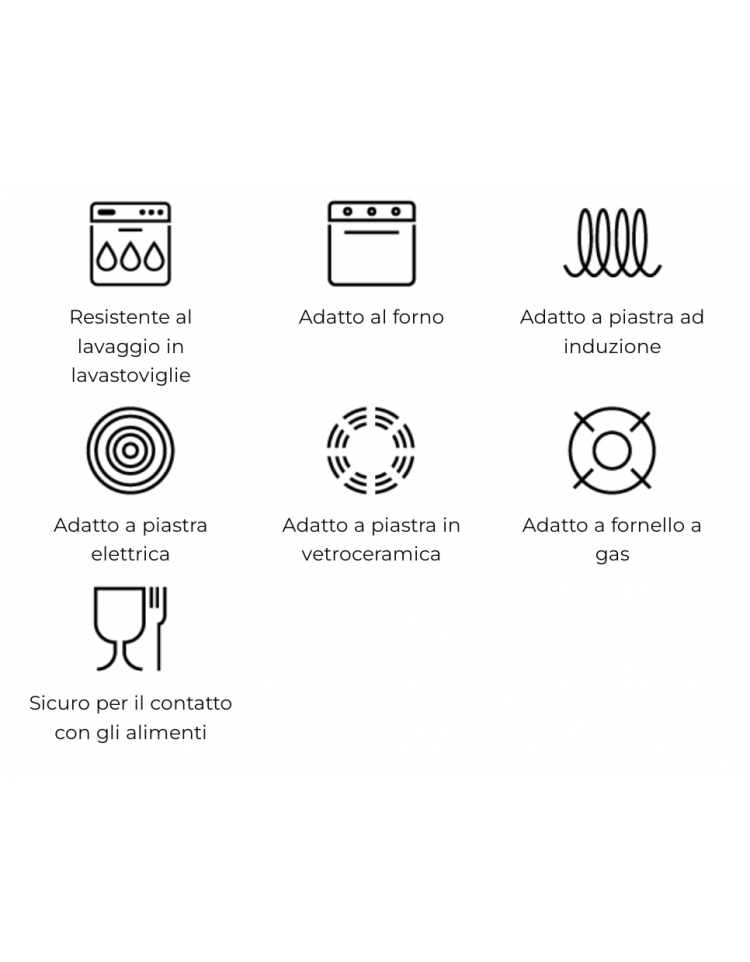 Idonea all’uso su tutte le fonti di cottura (gas, elettriche, vetroceramica, induzione) e forni (gas, petrolio, carbone o legna) ad esclusione di microonde.