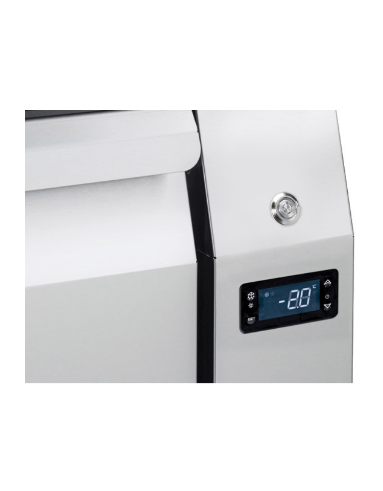 Dall’aspetto pulito ed essenziale, questo modello con piano in acciaio inox è perfetto per risparmiare spazio e offrire una postazione di lavoro refrigerata in qualsiasi cucina professionale. È un perfetto esempio di efficienza, modello a doppia temperatura (facilmente convertibile da chiller in freezer) cassetto doppio scorrevole con guide telescopiche adatto a 6 teglie GN 1/1 (non incluse), termostato digitale, vano motore sul fondo, filtro condensatore facilmente rimovibile per una manutenzione e una pulizia agevoli e motore scorrevole facilmente estraibile per una manutenzione post-vendita gestibile. Per completare l’elenco delle caratteristiche di alto livello, è dotato di R290 ecologico e di 4 ruote piroettanti per un facile posizionamento.