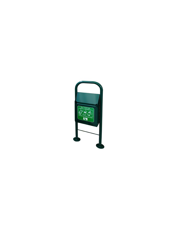 Cestino per deiezioni canine costruito in lamiera, dispone di un coperchio girevole che consente l’inserimento dei rifiuti e di una porta posteriore, che aperta, facilita l’estrazione del sacchetto fissato sulla struttura reggisacco. Il cestino è fissato ad un archetto in tubolare fissato a terra tramite tasselli ad espansione. Le parti metalliche sono zincate e verniciate a polveri poliestere termoindurenti nelle diverse colorazioni RAL.