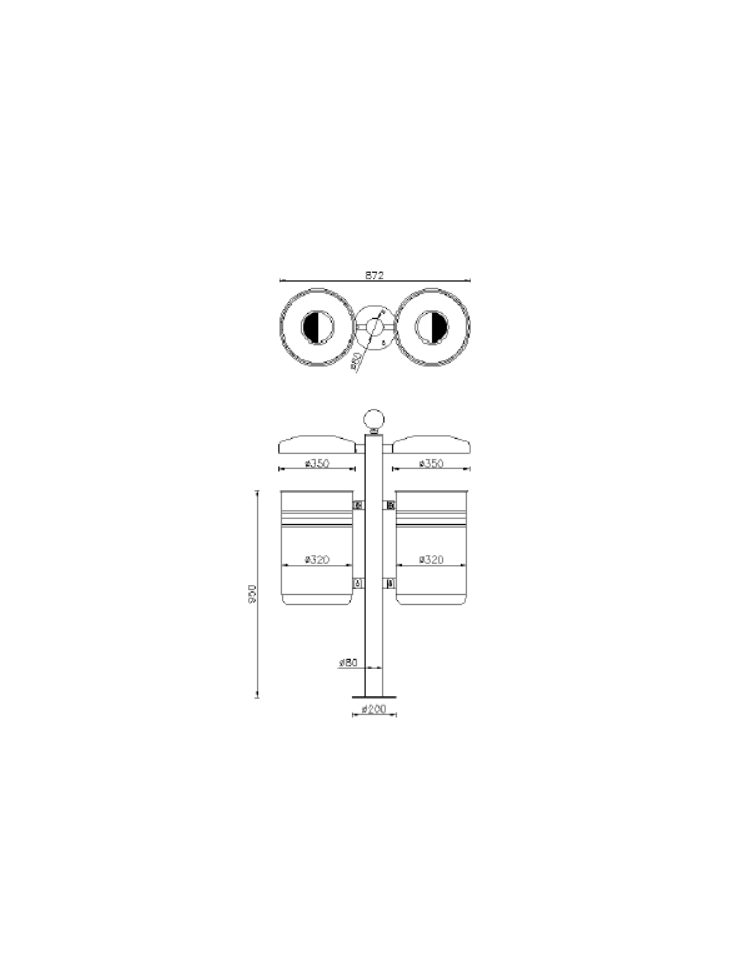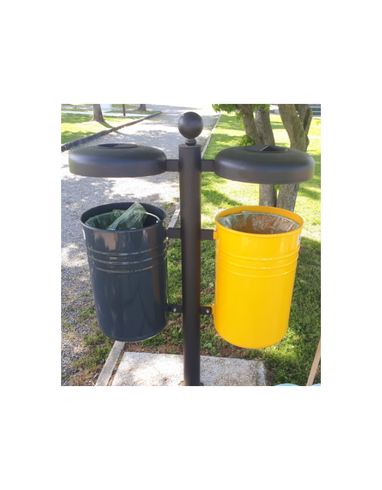Cestino per la raccolta differenziata ideale per l’esterno, composto da 2 contenitori a forma cilindrica ottenuto dalla calandratura di lamiera prezincata, chiuso tramite elettrosaldatura. La parte superiore viene bordata con un anello elettrosaldato ottenuto da tornitura in lastra, mentre la parte inferiore viene chiusa con un fondello opportunamente forato per l’eventuale scolo di acqua meteorica o di periodica pulizia. Viene fornito completo di reggisacco in acciaio incernierato sul bordo interno superiore dei contenitori e libero di ruotare per facilitare l’inserimento del sacchetto. Per togliere il sacchetto, bisogna svitare leggermente la vite e far ruotare il contenitore di 45°. I contenitori vengono fissati alla colonna di sostegno in tubolare di acciaio, chiusa superiormente come ornamento da una sfera in acciaio forgiato, mente la parte inferiore è dotata di flangia predisposta di n.3 fori per il fissaggio al suolo tramite tasselli ad espansione. È dotato di coperchi per riparare da eventi atmosferici saldati sul palo e all’interno sono dotati di posacenere estraibile. Il cestino è zincato e verniciato con polveri poliestere termoindurenti nelle diverse colorazioni RAL. La viteria è in acciaio inox.