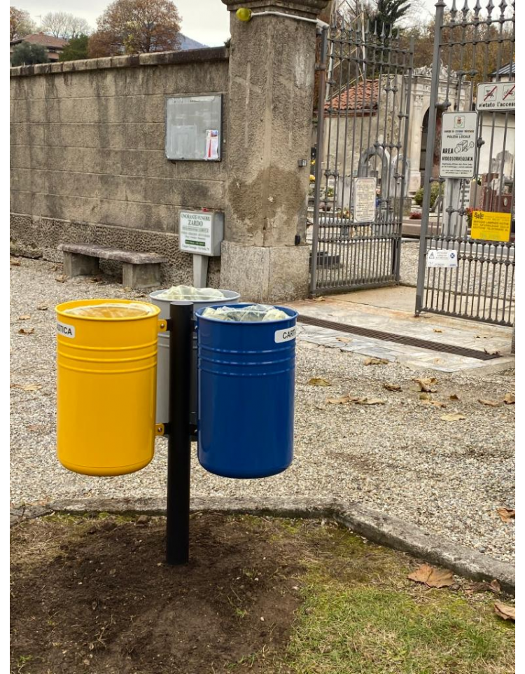 Cestino per la raccolta differenziata ideale per l’esterno, composto da 3 contenitori a forma cilindrica ottenuto dalla calandratura di lamiera prezincata, chiuso tramite elettrosaldatura. La parte superiore viene bordata con un anello elettrosaldato ottenuto da tornitura in lastra, mentre la parte inferiore viene chiusa con un fondello opportunamente forato per l’eventuale scolo di acqua meteorica o di periodica pulizia. Viene fornito completo di reggisacco in acciaio incernierato sul bordo interno superiore dei contenitori e libero di ruotare per facilitare l’inserimento del sacchetto. Per togliere il sacchetto, bisogna svitare leggermente la vite e far ruotare il contenitore di 45°. I contenitori vengono fissati alla colonna di sostegno in tubolare di acciaio, chiusa superiormente come ornamento da una sfera in acciaio forgiato, mente la parte inferiore è dotata di flangia predisposta di n.3 fori per il fissaggio al suolo tramite tasselli ad espansione. È dotato di coperchi per riparare da eventi atmosferici saldati sul palo e all’interno sono dotati di posacenere estraibile. Il cestino è zincato e verniciato con polveri poliestere termoindurenti nelle diverse colorazioni RAL. La viteria è in acciaio inox.