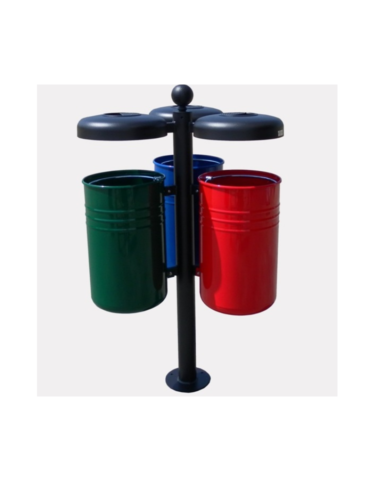 Cestino per la raccolta differenziata ideale per l’esterno, composto da 3 contenitori a forma cilindrica ottenuto dalla calandratura di lamiera prezincata, chiuso tramite elettrosaldatura. La parte superiore viene bordata con un anello elettrosaldato ottenuto da tornitura in lastra, mentre la parte inferiore viene chiusa con un fondello opportunamente forato per l’eventuale scolo di acqua meteorica o di periodica pulizia. Viene fornito completo di reggisacco in acciaio incernierato sul bordo interno superiore dei contenitori e libero di ruotare per facilitare l’inserimento del sacchetto. Per togliere il sacchetto, bisogna svitare leggermente la vite e far ruotare il contenitore di 45°. I contenitori vengono fissati alla colonna di sostegno in tubolare di acciaio, chiusa superiormente come ornamento da una sfera in acciaio forgiato, mente la parte inferiore è dotata di flangia predisposta di n.3 fori per il fissaggio al suolo tramite tasselli ad espansione. È dotato di coperchi per riparare da eventi atmosferici saldati sul palo e all’interno sono dotati di posacenere estraibile. Il cestino è zincato e verniciato con polveri poliestere termoindurenti nelle diverse colorazioni RAL. La viteria è in acciaio inox.